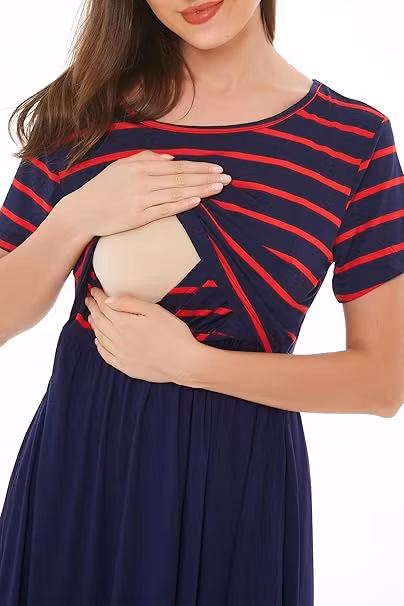 Denna amningsklänning är designad för att ge maximal komfort och funktionalitet för ammande mödrar. Tillverkad av ett supermjukt och stretchigt material som inte är genomskinligt, erbjuder den en skön och smickrande passform som gör den perfekt för både vardagsbruk och mer speciella tillfällen.