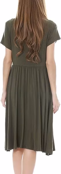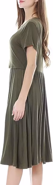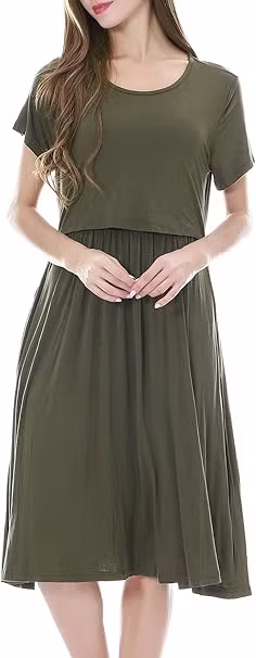 Denna amningsklänning i stilren armégrön färg är ett perfekt val för ammande mammor som vill kombinera komfort med en modern look. Tillverkad av ett supermjukt och stretchigt material som inte är genomskinligt, ger den en smickrande passform och en skön känsla mot huden – perfekt för daglig användning.