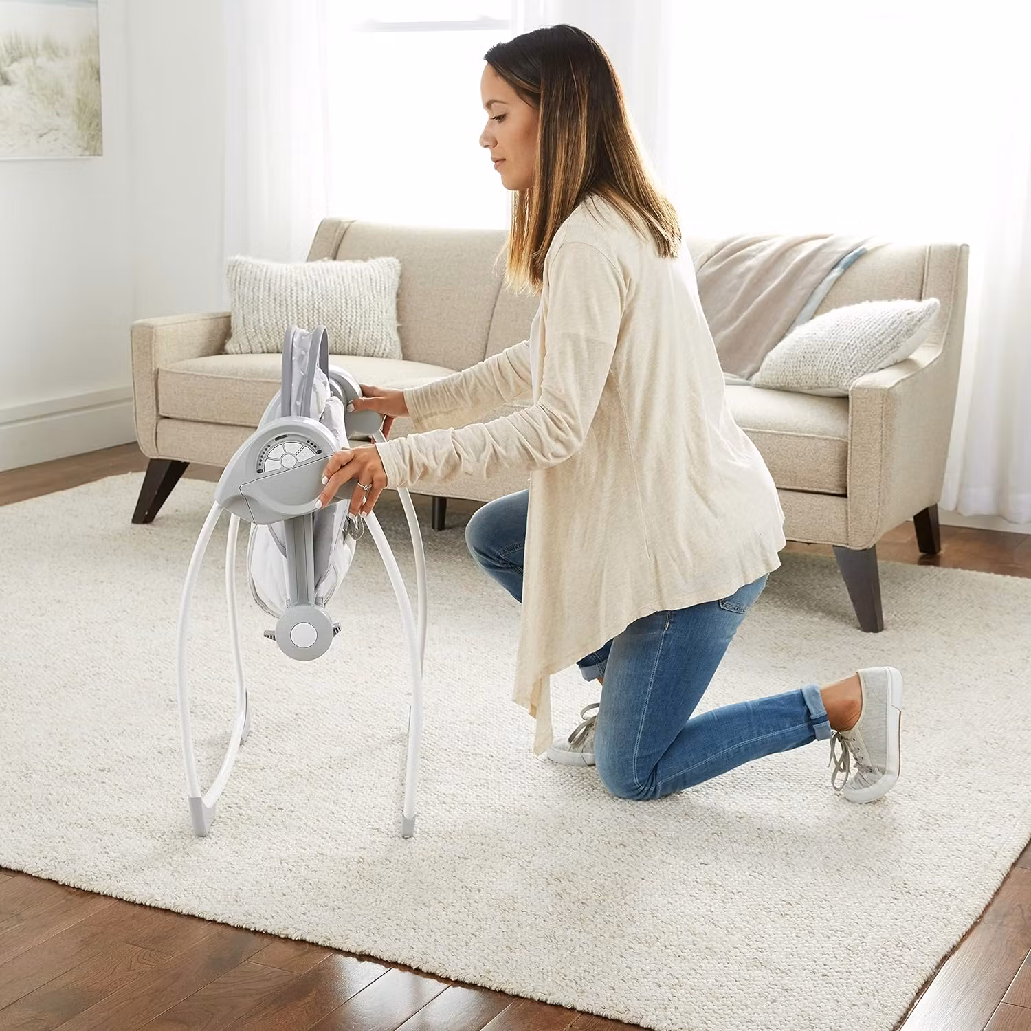 Babygungan är designad för att vara både kompakt och lätt att fälla ihop, vilket gör den perfekt för resor eller för att enkelt flyttas runt i hemmet. Denna babygunga kombinerar bekvämlighet, portabilitet och komfort, vilket gör den till ett oumbärligt hjälpmedel för varje förälder.