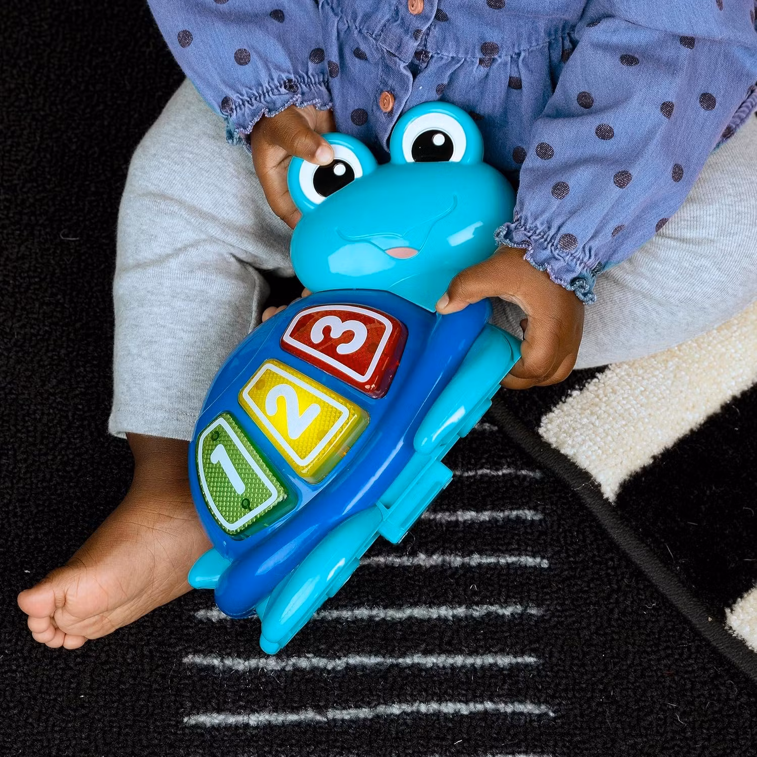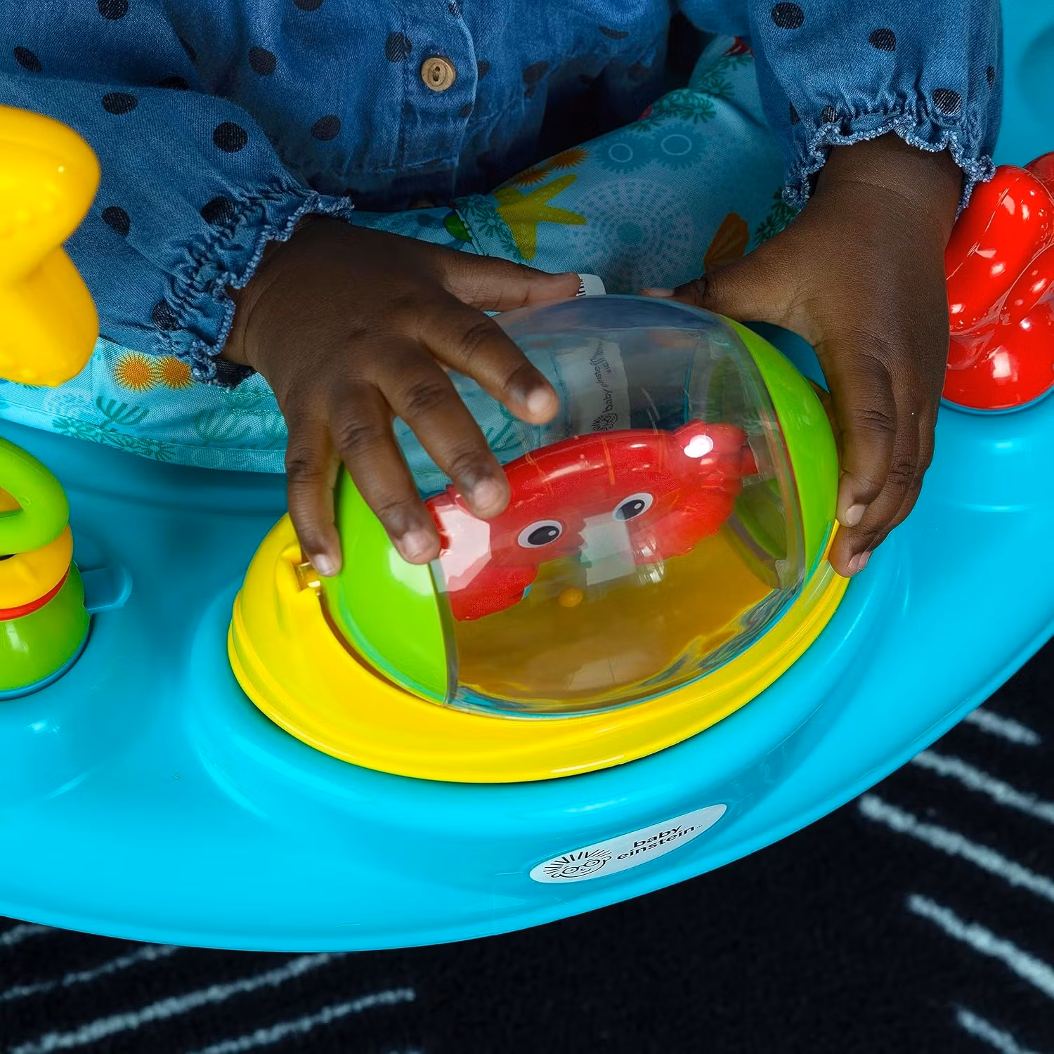 Baby Einstein Curiosity Cove hoppgunga bjuder in till interaktiv lek där musik, ljus och språk möts. Den medföljande Neptun-sköldpaddan kan tas loss för lek på golvet och spelar både melodier och havsljud som väcker barnets nyfikenhet. Hoppgungan har tre spellägen – piano, melodi och lärande – som introducerar färger och siffror på fyra språk. Sätet kan roteras 360 grader för fri rörelse, och höjden justeras i fyra nivåer för att passa barnets tillväxt. De sex leksakerna tränar finmotorik och koncentration, och extra slingor gör det möjligt att fästa fler. En hoppgunga som förenar musik, rörelse och inlärning i ett underhållande havstema.