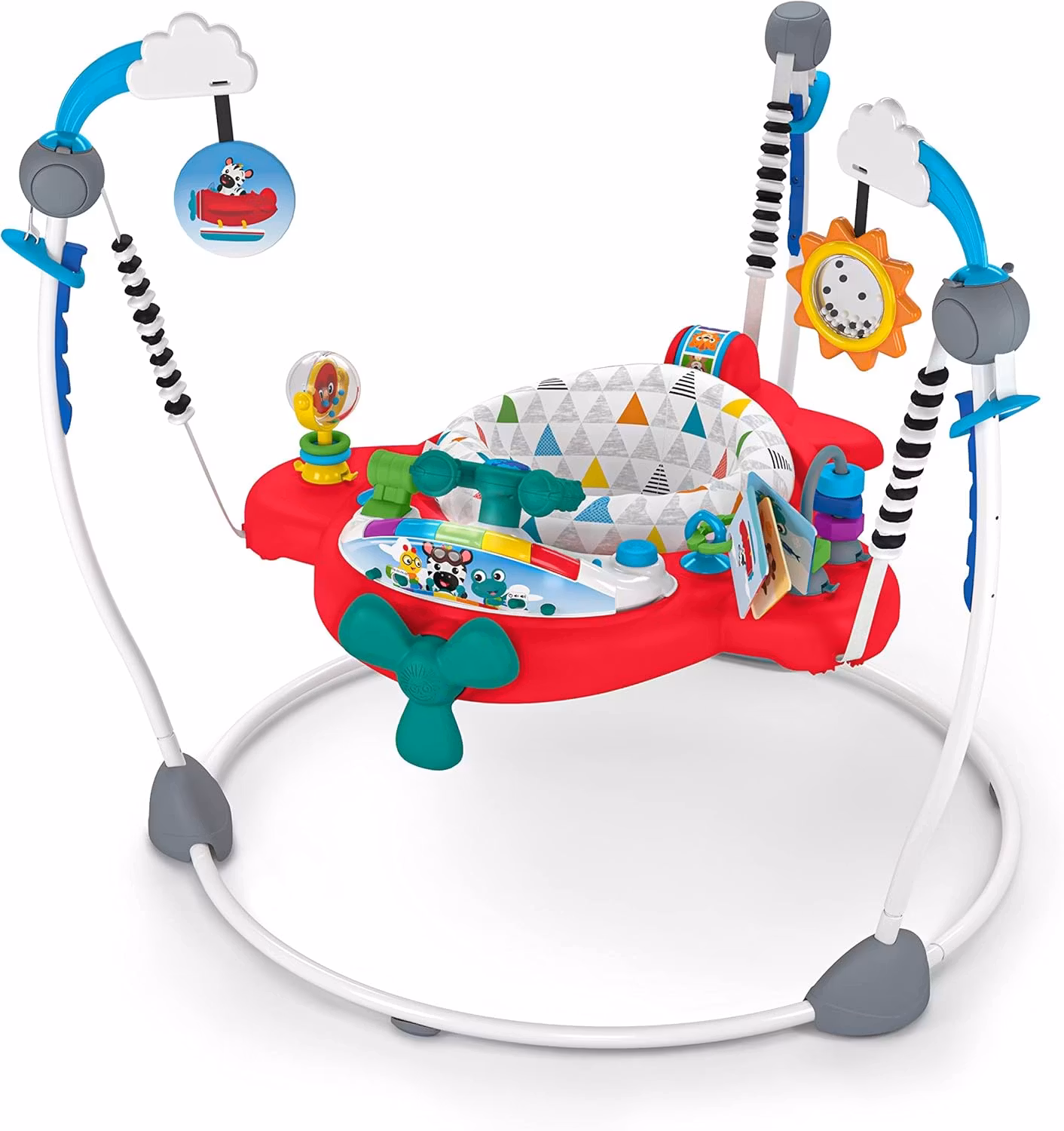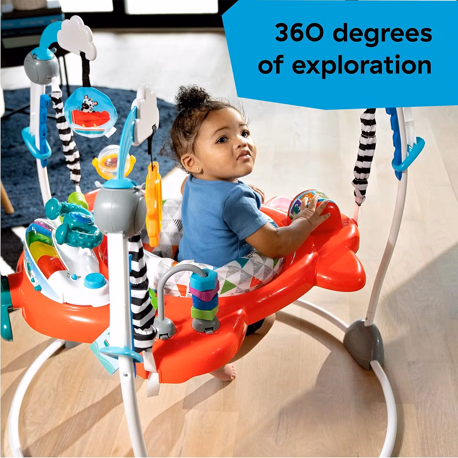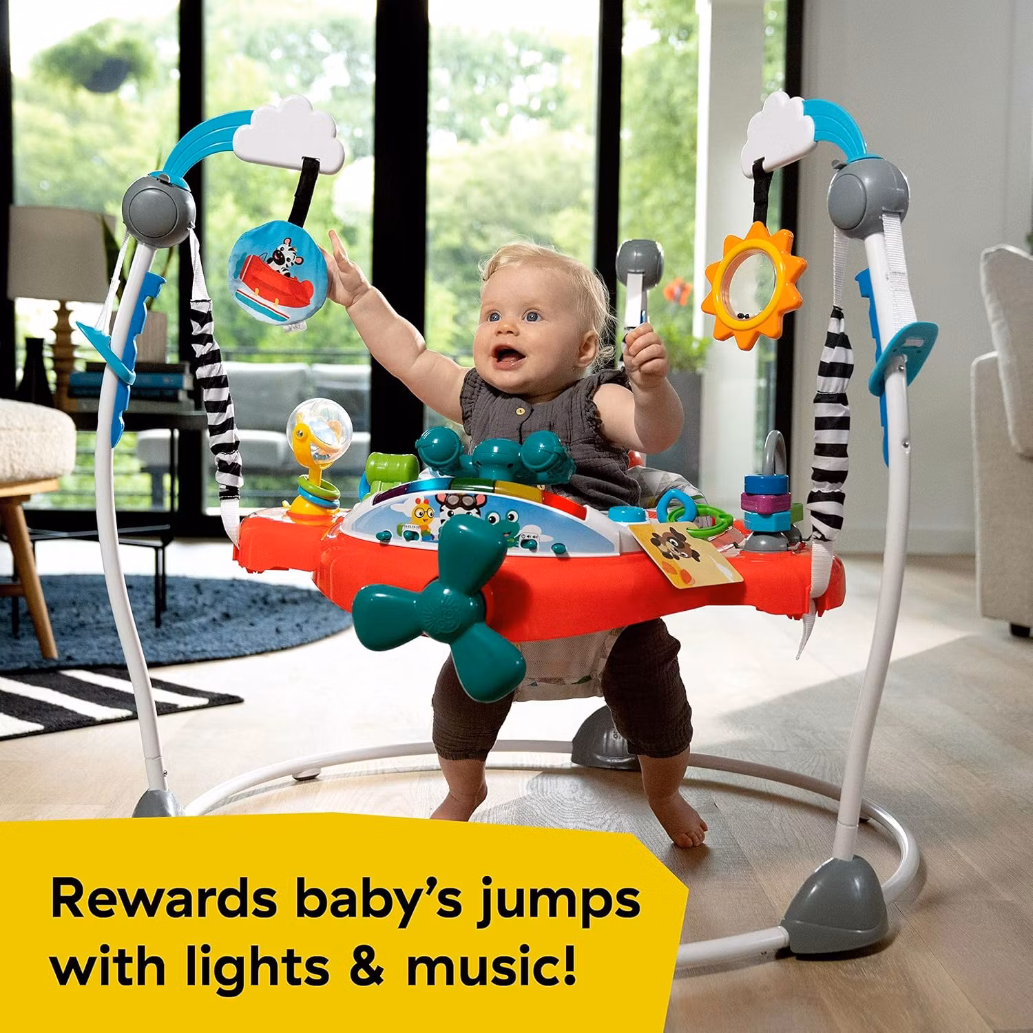Baby Einstein hoppgunga Ocean Explorers tar barnet med på ett färgstarkt äventyr fyllt av musik, ljus och lärande. Den 2-i-1-designen fungerar både som hoppgunga och fristående lekstation på golvet. Barnet kan hoppa, trycka och snurra för att aktivera mer än 20 melodier och ljud, samtidigt som grov- och finmotoriken tränas. Den roterande sitsen på 360° gör att barnet enkelt når alla sidor, medan fyra höjdjusteringar låter gungan växa i takt med barnet. Genom lek lär sig barnet siffror, färger och former på fyra språk – engelska, franska, tyska och spanska. Den mjuka sittdynan kan tvättas i maskin, och alla ytor är lätta att torka av. En hoppgunga som kombinerar lek, språk och utveckling i ett underhållande aktivitetscenter.
