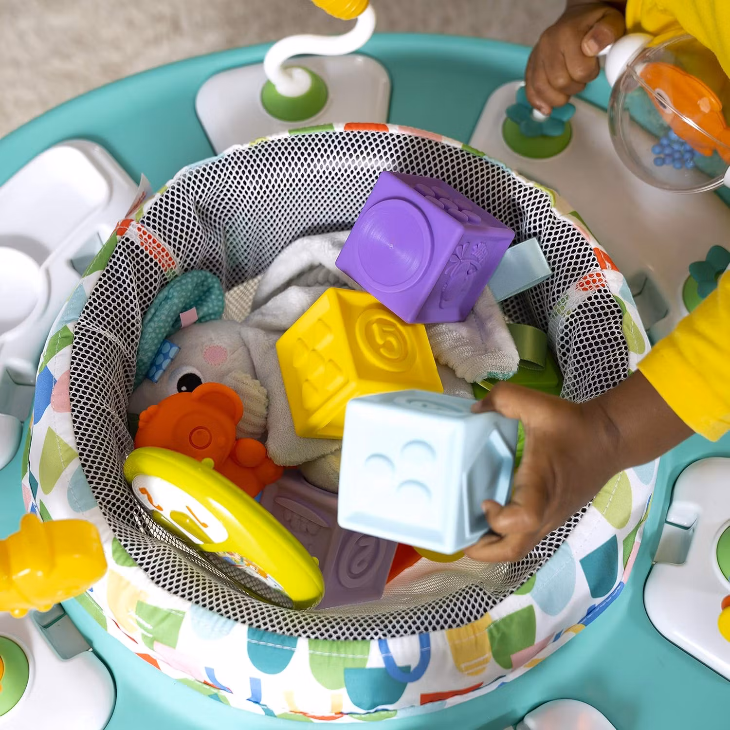 När barnet växer omvandlas hoppgungan enkelt till ett lekbord. Studsplattan tas bort och sitsen ersätts med den medföljande förvaringspåsen, perfekt för att hålla ordning på alla leksaker. Barnet kan sedan stå och leka vid bordet, med sina favoritleksaker nära till hands.
