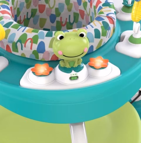 I hoppgungaläget kan höjden justeras i tre olika nivåer, så att barnet alltid står stadigt med fötterna mot studsplattan. Den 360° roterande sitsen gör det enkelt att nå alla sju interaktiva leksaker. Den elektroniska grodan spelar musik, gör roliga ljud och har vackra näckrosblad med belysning som fångar barnets uppmärksamhet.