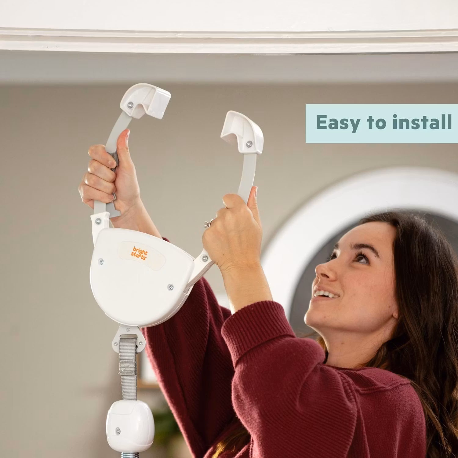 Hoppgungan fästs enkelt i de flesta dörrkarmar utan verktyg, tack vare den stabila klämman med extra säkerhetsbälte. Den passar väggar med en tjocklek på 10–12,7 cm och är testad för att sitta säkert på plats under lek. Höjden kan justeras i takt med att barnet växer, vilket ger lång användningstid.