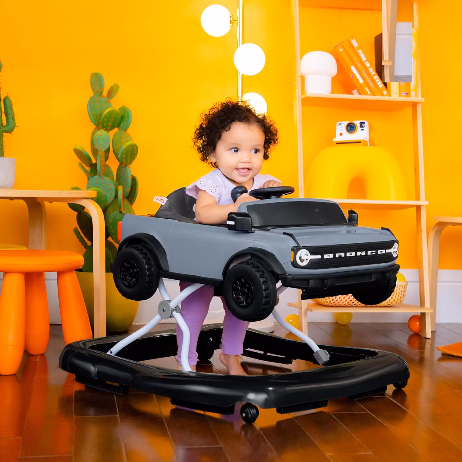 Bright Starts gåstol Ford Bronco kombinerar lek, utveckling och äventyr i ett. Med fyra olika lekmöjligheter – från traditionell gåstol till glidfunktion – följer den barnet genom flera utvecklingsfaser. Den avtagbara leksaksstationen har autentiska detaljer som motorljud, lampor, växelspak och ratt som stimulerar fantasin. Två barn kan leka samtidigt tack vare gång- och glidlägena, vilket gör den perfekt för syskon eller små vänner. Ramen kan justeras i tre höjder så att stolen växer med barnet. En gåstol som bjuder på realistisk körglädje, trygghet och massor av lekfull energi.