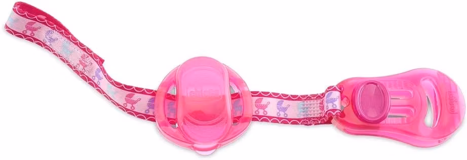 Denna napphållare är utrustad med ett spännband med sugskydd, en klämma och kardborrband, vilket gör det enkelt att fästa nappen säkert på barnets kläder.