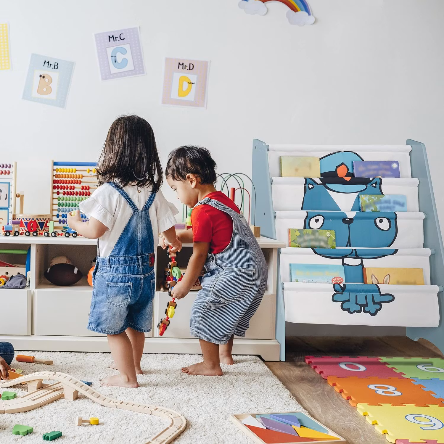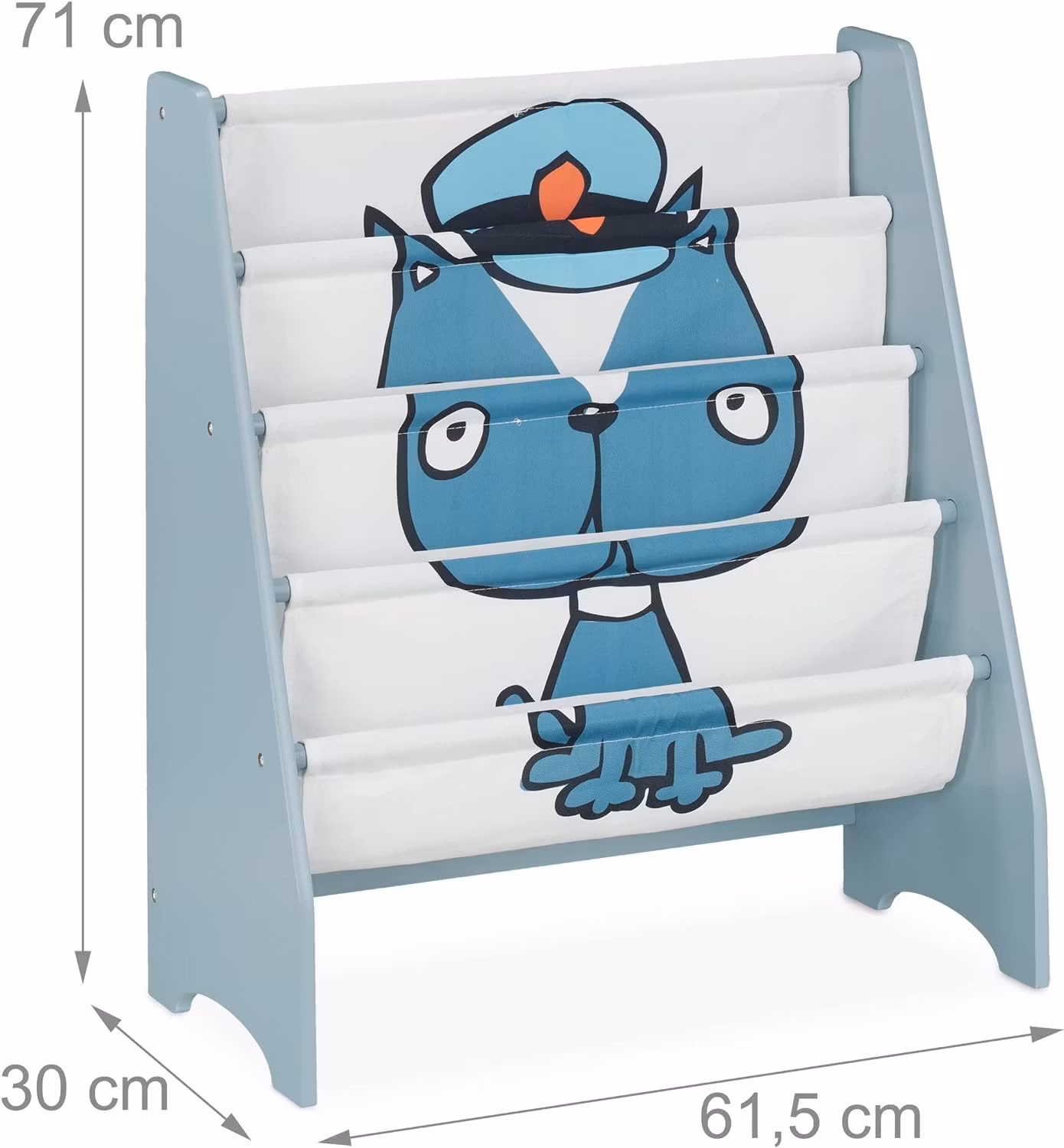 Relaxdays barnbokhylla kombinerar funktion med charm i en ljusblå design med ett sött hundmotiv. Den har fyra fack som erbjuder praktisk förvaring för barnböcker och tidskrifter, vilket uppmuntrar barn till att läsa genom att göra böckerna lättillgängliga. Tillverkad av hållbart MDF och tyg med barnsäkra rundade kanter. Den barnvänliga storleken och öppna designen gör det enkelt för barn att nå och välja sina favoritböcker.
