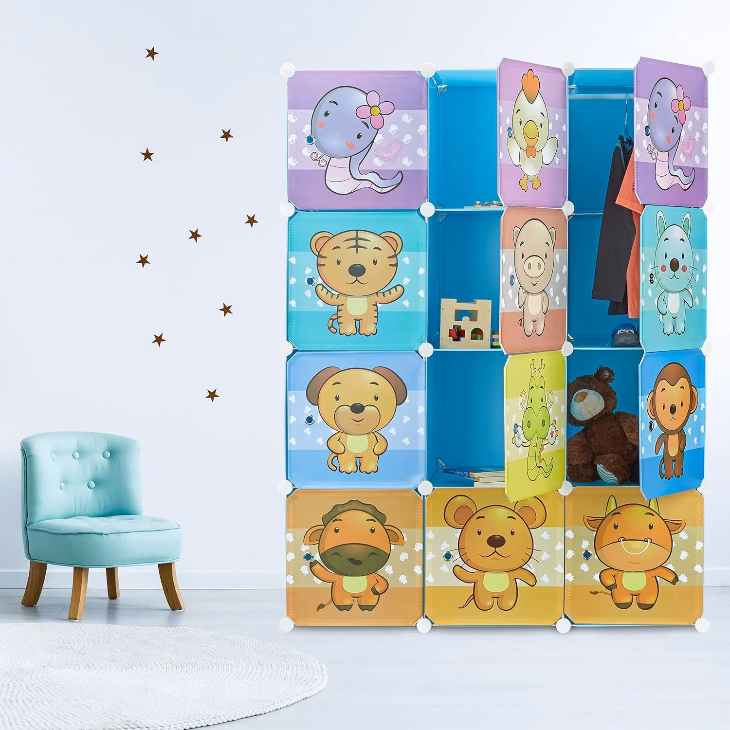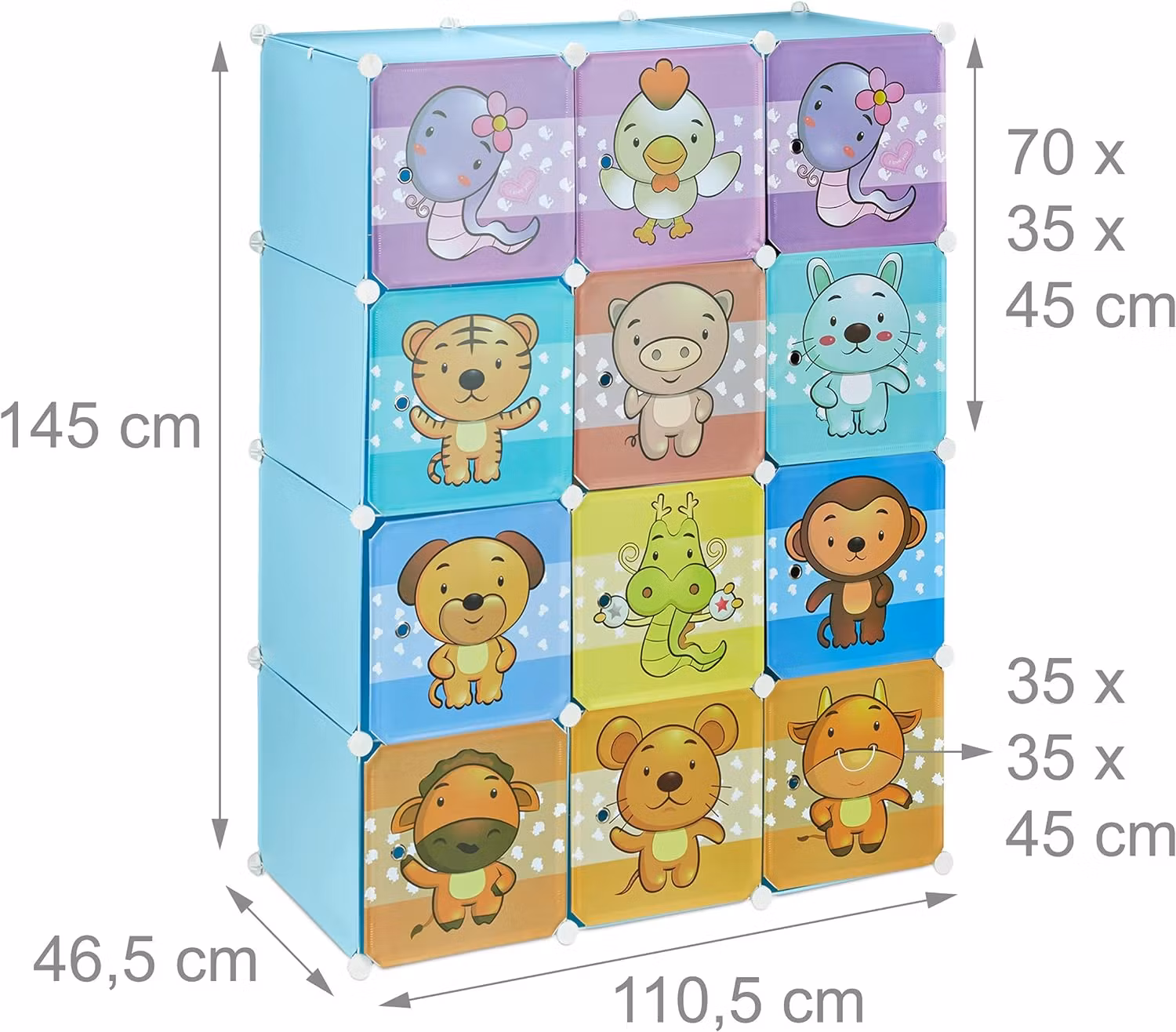 Relaxdays garderob för barnrum är en färgglad och praktisk förvaringslösning som gör ordning och reda till ett nöje. Denna DIY-hylla lyser upp rummet med roliga djurmotiv på varje fack. Den erbjuder gott om plats för kläder, böcker, och leksaker, och håller barnrummet organiserat och prydligt. Tillverkad av robust plast är den lättskött och rengörs enkelt med en fuktig trasa. Plug-in system gör monteringen enkel utan behov av borrning eller skruvning, perfekt för en snabb och smidig installation.
