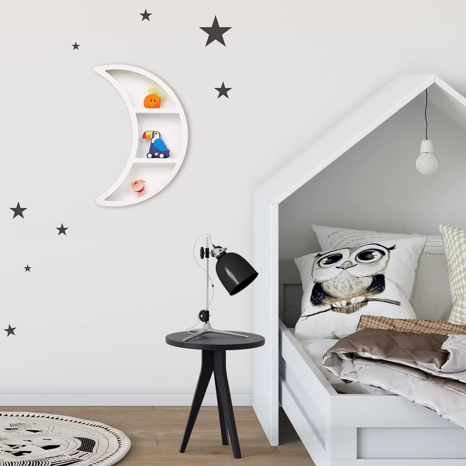 Denna vita dekorativa hylla är formad som en halvmåne, vilket bidrar med en drömlik känsla i rummet. Den erbjuder praktiskt förvaringsutrymme för dekorationer, kosmetika, figurer och mycket mer, vilket gör den idealisk för användning i vardagsrummet, sovrummet och barnrummet.