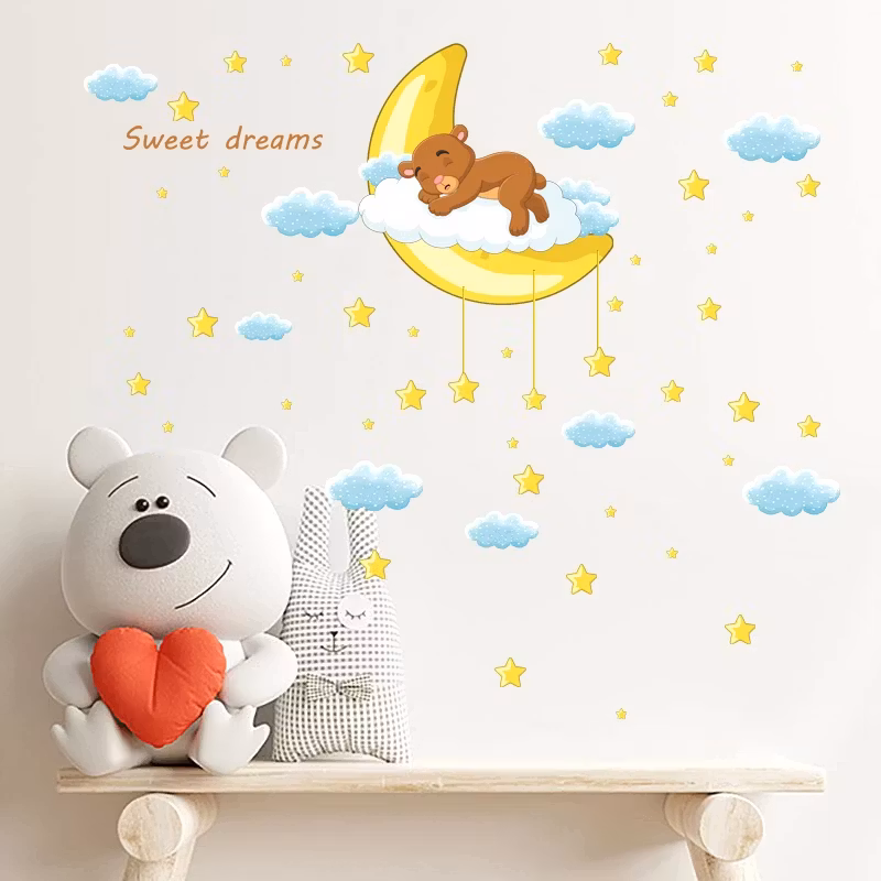 Dreamscape Väggdekal Sweet Dreams skapar en lugn och harmonisk atmosfär i barnrummet. Med sitt mjuka och drömlika motiv blir denna väggdekal en perfekt detalj för att ge en trygg och mysig känsla vid läggdags.