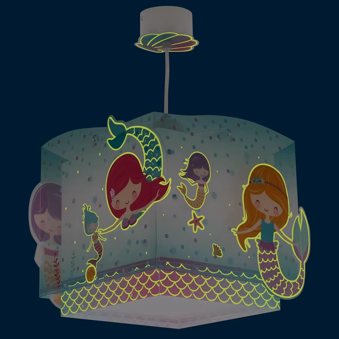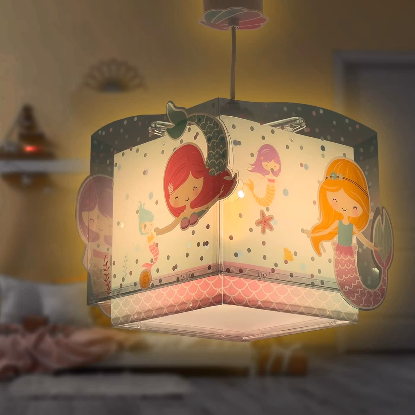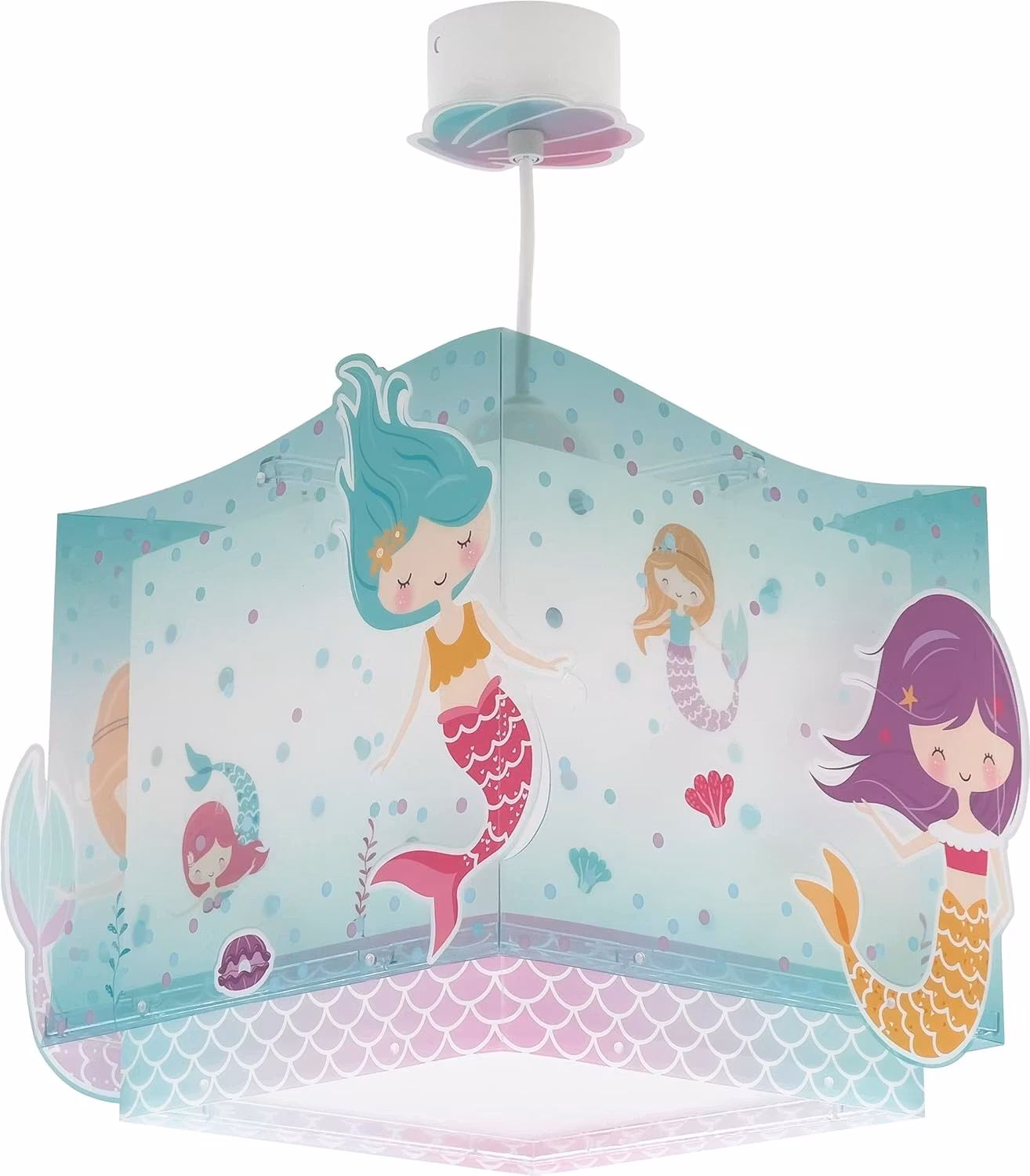 Dalber taklampa Mermaid är en förtrollande och färgglad taklampa som skapar en magisk atmosfär i barnrummet. Med sitt vackra sjöjungfrumotiv och mjuka pastellfärger ger den rummet en sagolik känsla, perfekt för små som älskar havets magiska värld.