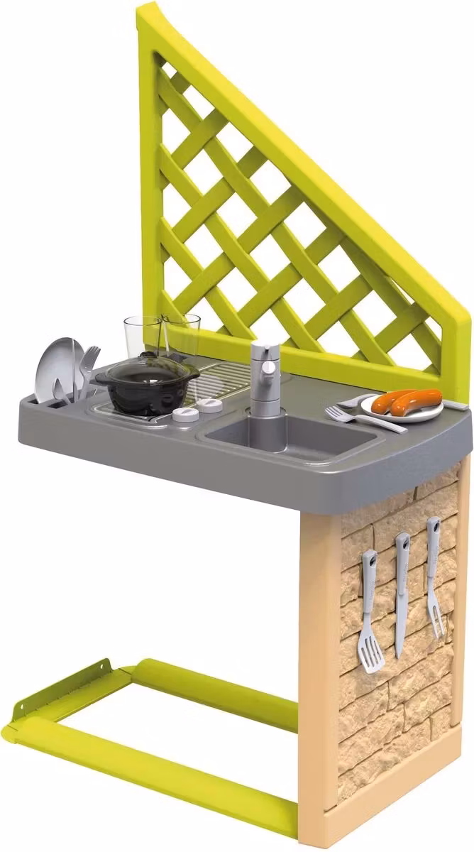 - Lekhusen kan utökas med detta detaljerade sommarkök: den kompakta köksutbyggnaden kan köpas separat och har en grill, ett handfat med en liten vattenkran och 17 tillbehör, bestående av bland annat två glas, två tallrikar, bestick, köksredskap och en gryta och två korvar.