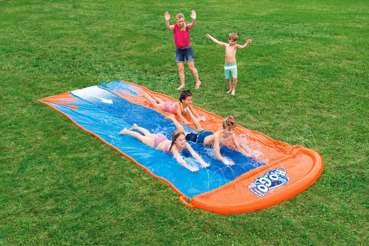 En vattenslide med tre fält från Bestway, perfekt för de spralliga barnen. Enkel att montera- koppla i trädgårdsslangen och släng dig på den vattendränkta banan för att se vem som är snabbast i mål. Inbyggda sprinklers sprutar vatten för att hålla banan våt och ger dig en extra snabb åktur.