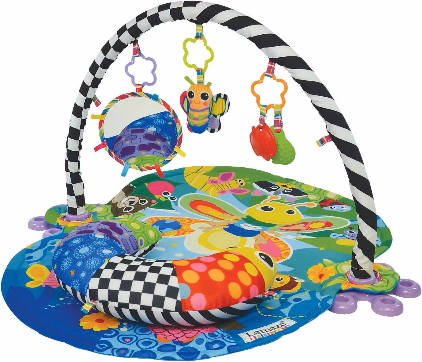 Den medföljande kudden har tydliga svartvita kontraster kombinerat med färgstarka mönster som fångar barnets blick och ger extra stöd vid magläge. Tre hängande leksaker med varierande texturer och former uppmuntrar till grepp, fokus och rörelse, vilket stärker både motorik och sinnesutveckling.