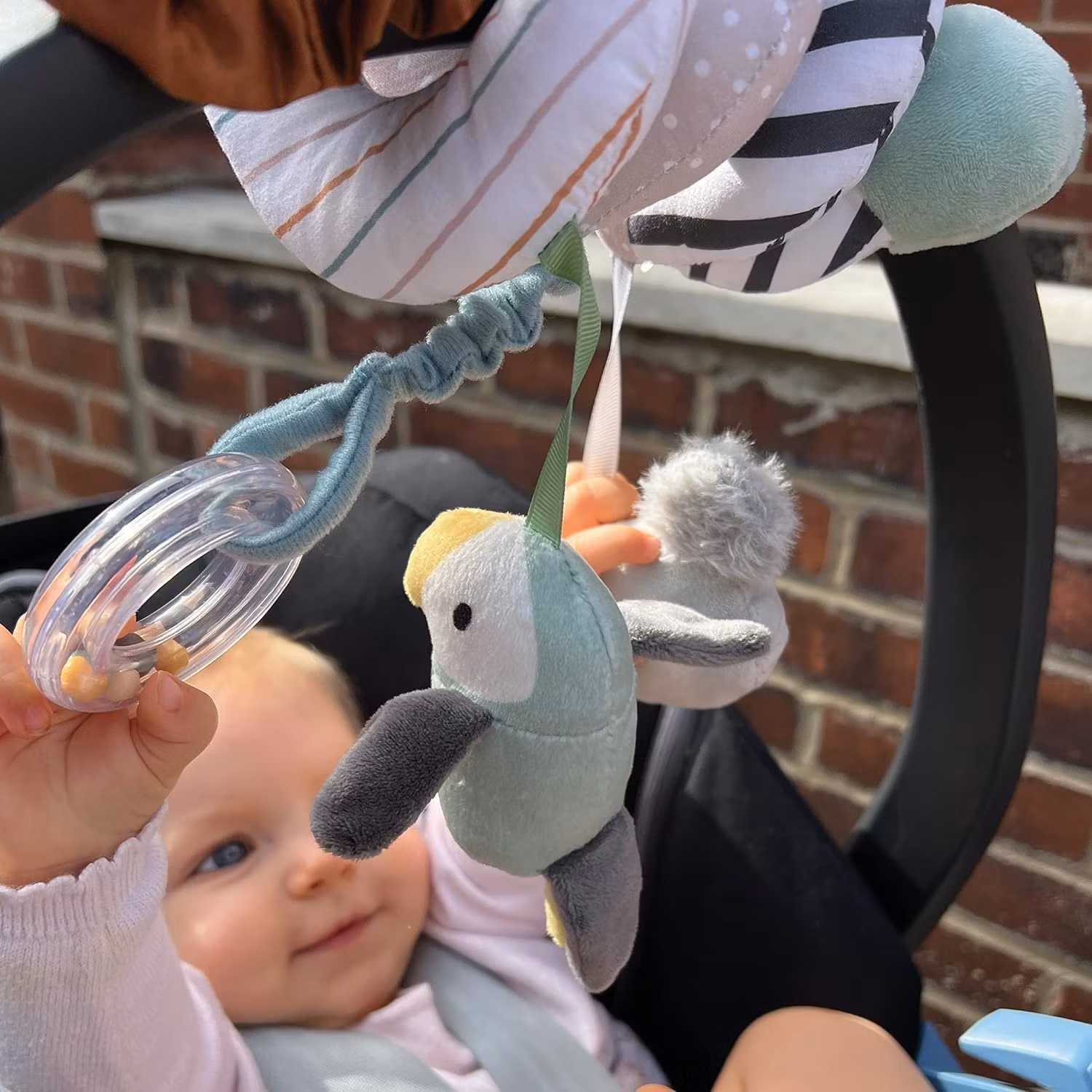 En underhållande barnvagnsleksak som är designad för att stimulera och glädja ditt barn under promenader. Den mjuka spiralen är lätt att fästa på barnvagnen, babyskyddet eller spjälsängen och håller barnet sysselsatt med sina färgglada och gosiga leksaker.