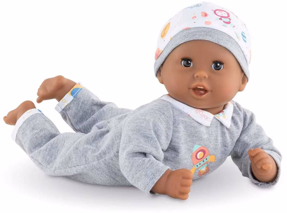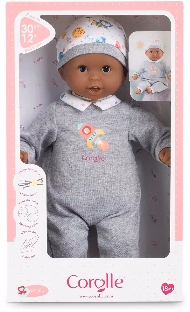 Corolle-dockan Marius förenar fransk elegans med barnslig charm. Med sin mjuka vinylkropp och förmågan att blunda är Marius en kärleksfull följeslagare för alla barn. Klädd i en stilren grå bodysuit med matchande mössa. Marius flexibla positioner och förmågan att hålla tummen i munnen tillför en realistisk känsla till lekstunden. Dessutom bär han på Corolles signaturdoft av vanilj.