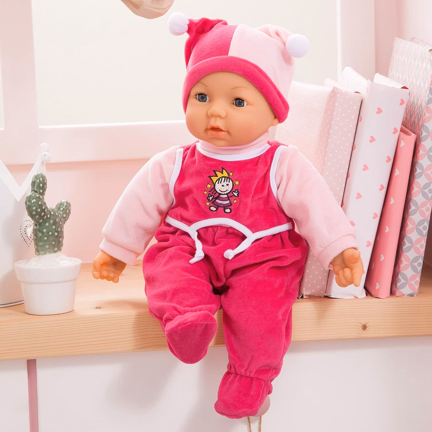 Bayer Design Hello Baby babydocka är 46 cm stor och har en mjuk kropp med realistiska funktioner. Dockan smackar och rör på munnen när den matas med flaska. Den säger "Mamma" eller "Pappa" när du trycker på händerna och börjar skratta om du klämmer på magen. När dockan ligger ner blundar den med ögonen. Hon är klädd i en söt sparkdräkt med en matchande mössa och levereras med napp och flaska för omsorg och lek.