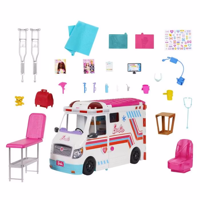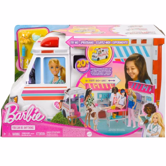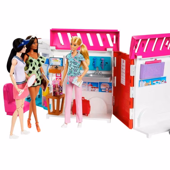 När det är dags att ge vård kan Barbie ambulans enkelt öppnas och förvandlas till en komplett klinik, där barnen kan skapa sina egna vårdscenarier. Setet innehåller över 20 medicinska tillbehör, såsom stetoskop, röntgenplåtar, termometer och mycket mer – allt som behövs för att ta hand om Barbies patienter.