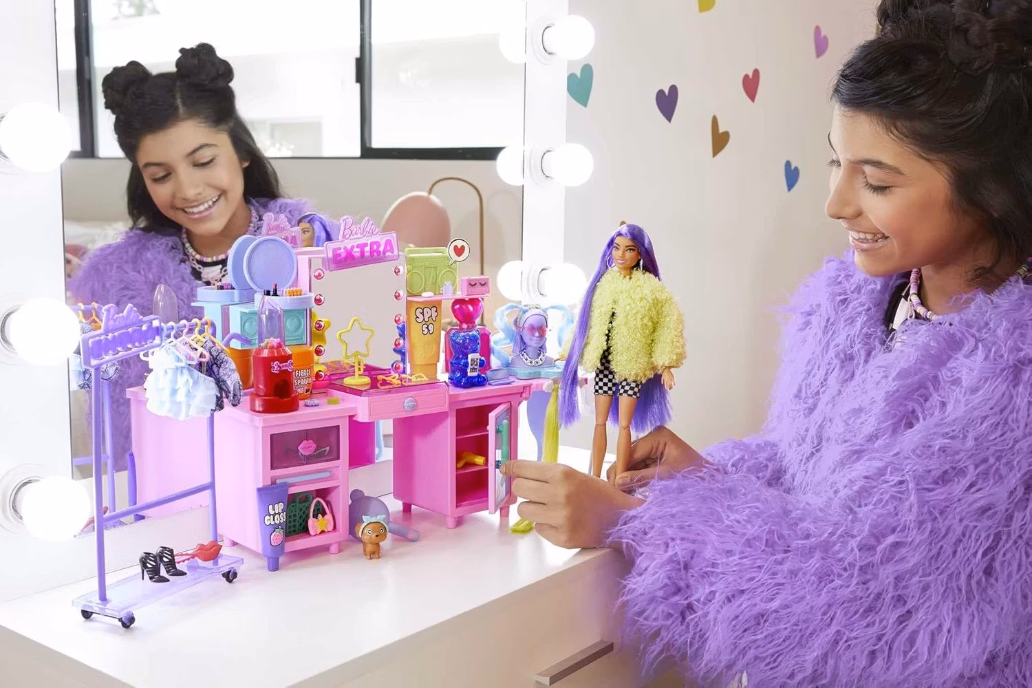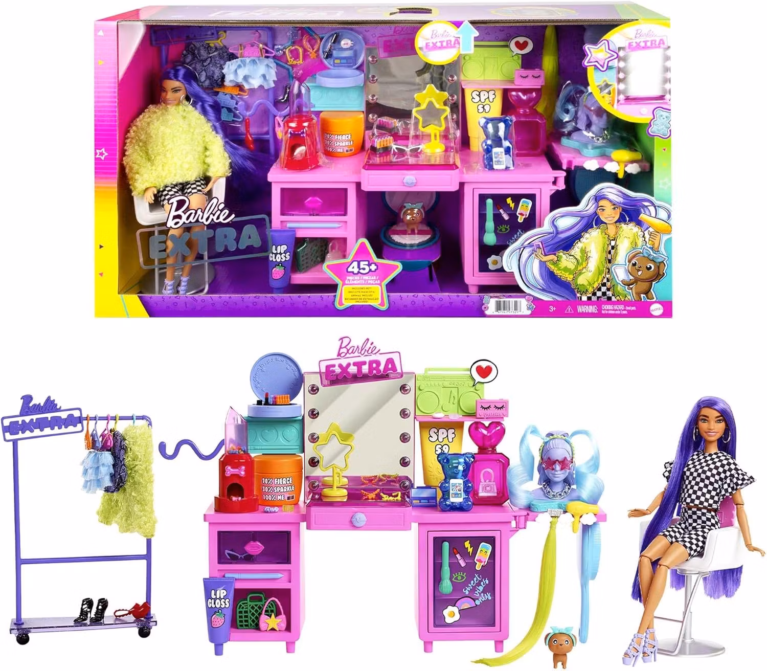Barbie Extra-leksetet är perfekt för små fashionistas som älskar att uttrycka sig med det där lilla extra! Detta sminkbordslekset innehåller en exklusiv Barbie Extra-docka med långt lila hår, klädd i trendiga och färgglada kläder.