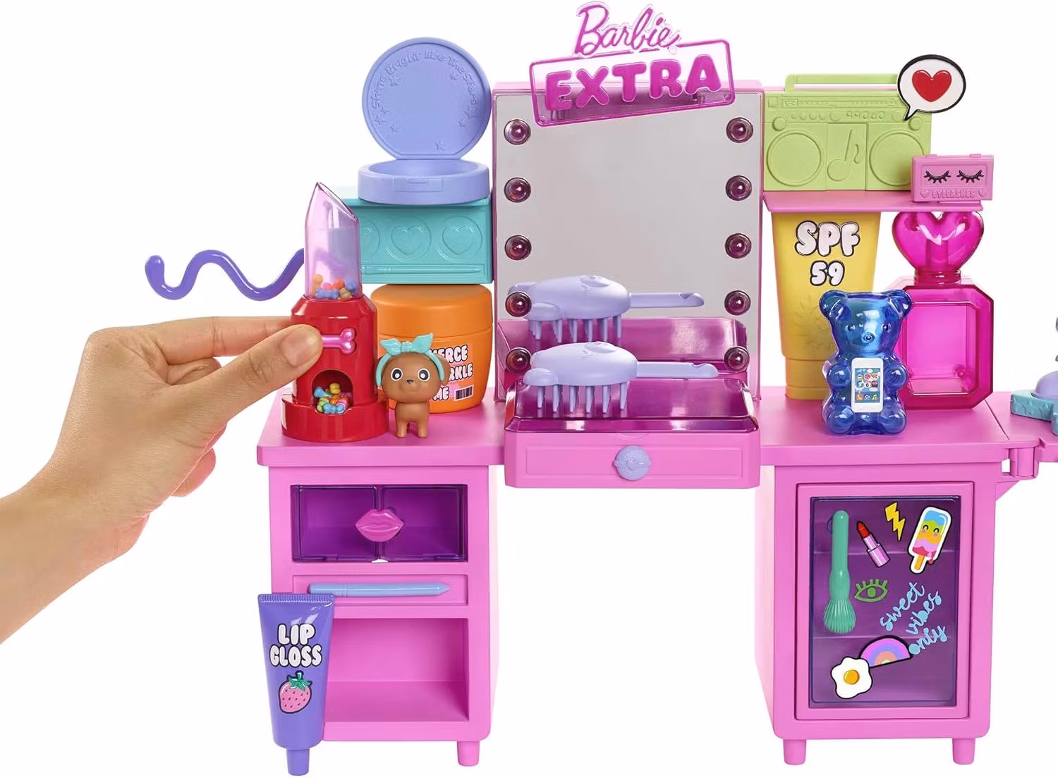 - Ett sminkbord med förvaring och en fungerande spegel som lyser i rosa när Barbie Extra-logotypen trycks på