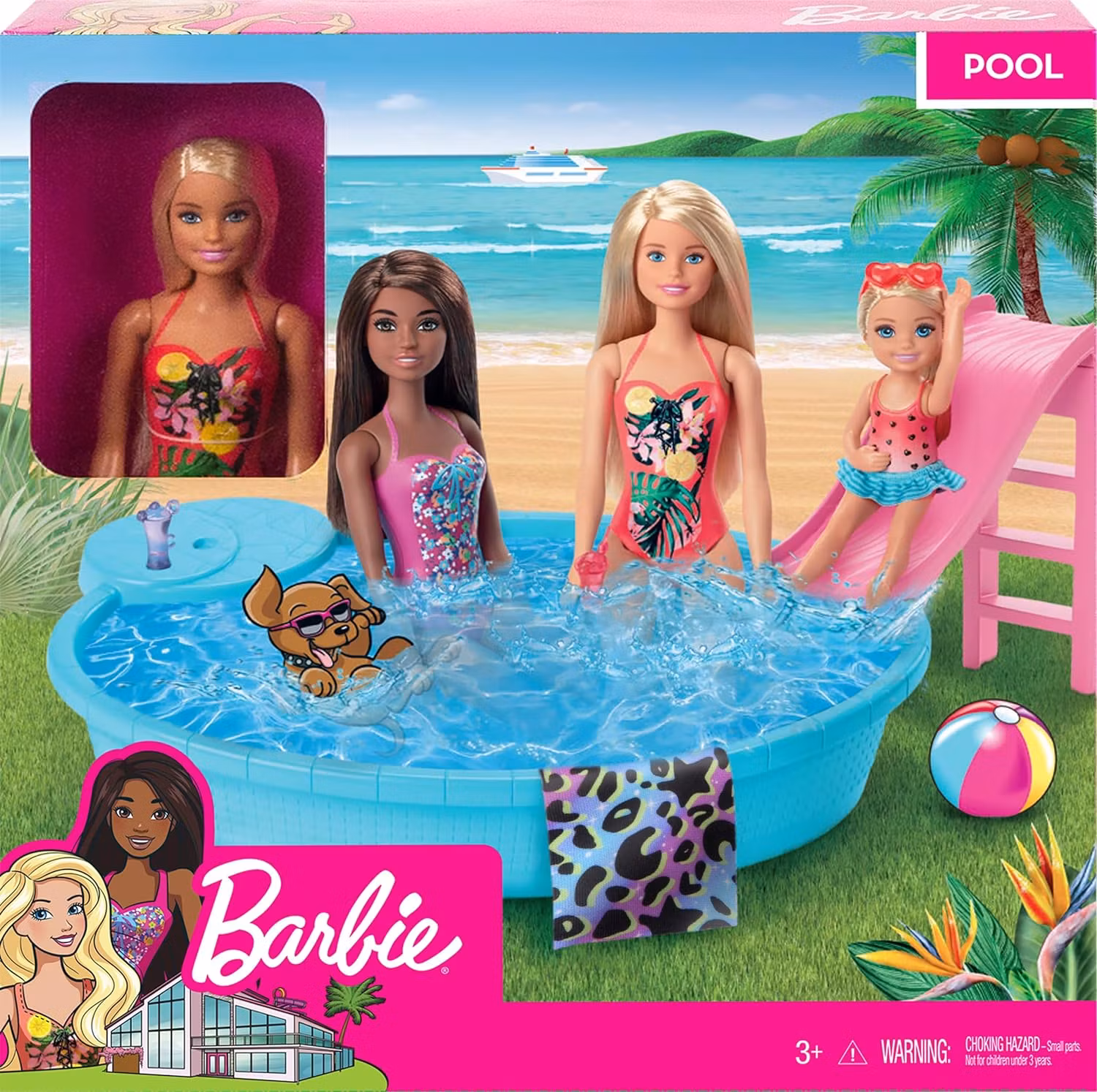 Välkommen till en dag i solen med Barbie Pool Lekset med Barbiedocka! I detta färgsprakande lekset med dockor får barnet skapa egna sommaräventyr där Barbie njuter av plask, avkoppling och svalkande drycker i sin stiliga pool.