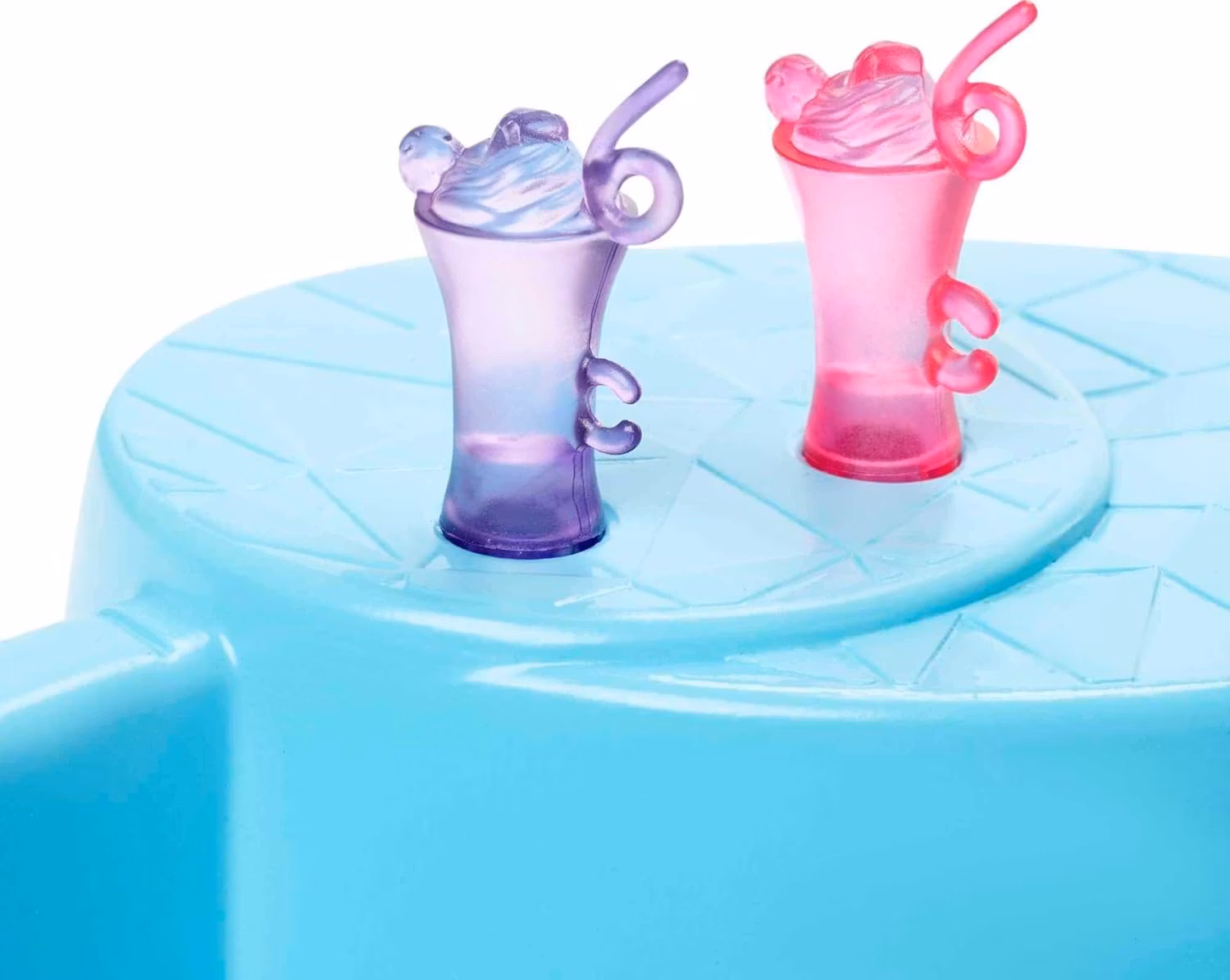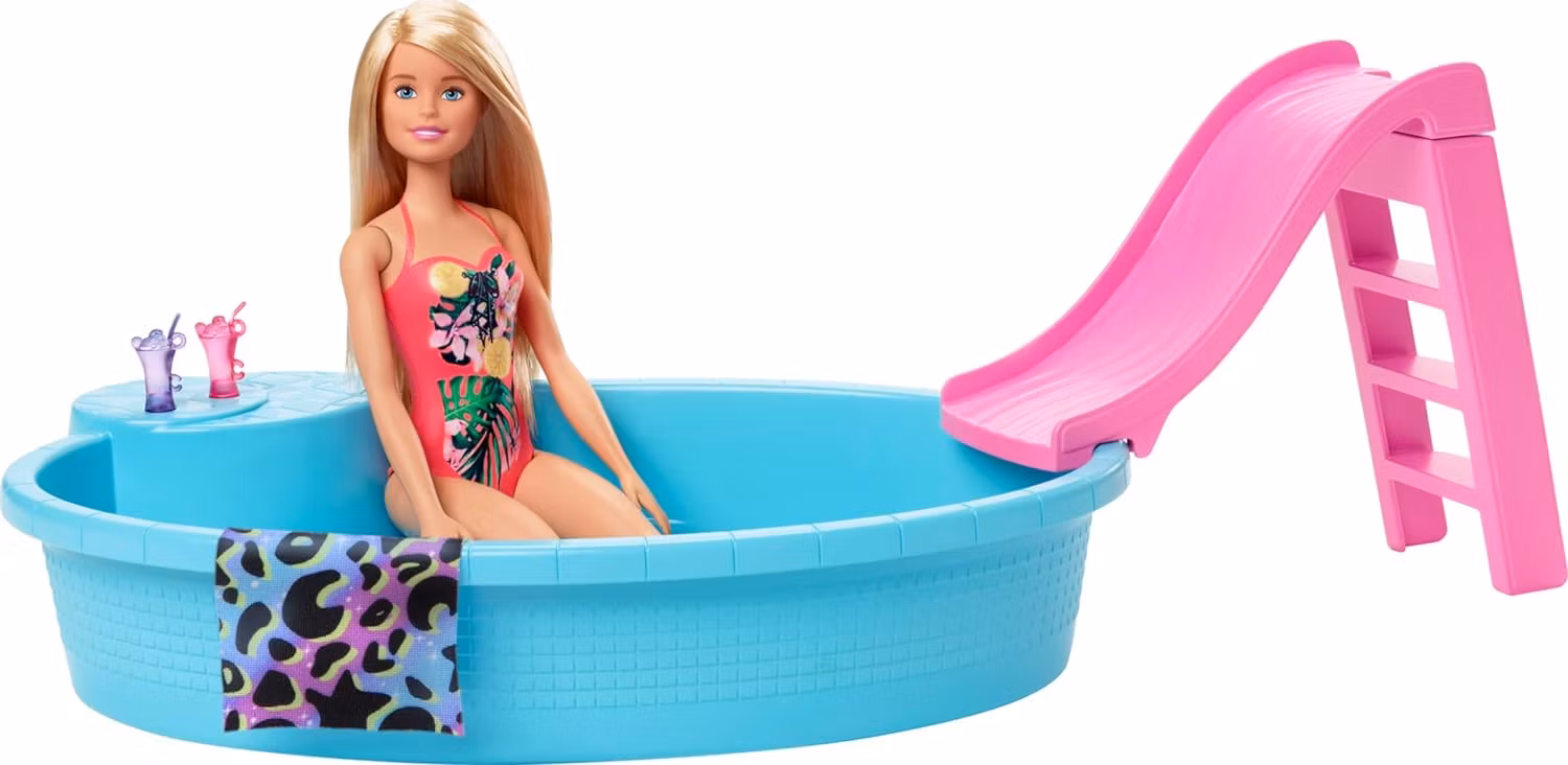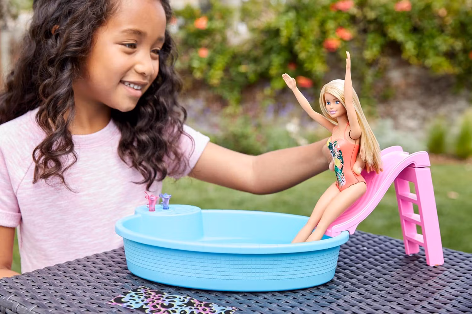 Barbie bär en fast rosa baddräkt med axelrem och palmmotiv, redo att glida nerför den medföljande rutschkanan. Poolen har två kopphållare och inkluderar dryckestillbehör – perfekt för fantasifulla rolllekar vid poolkanten.