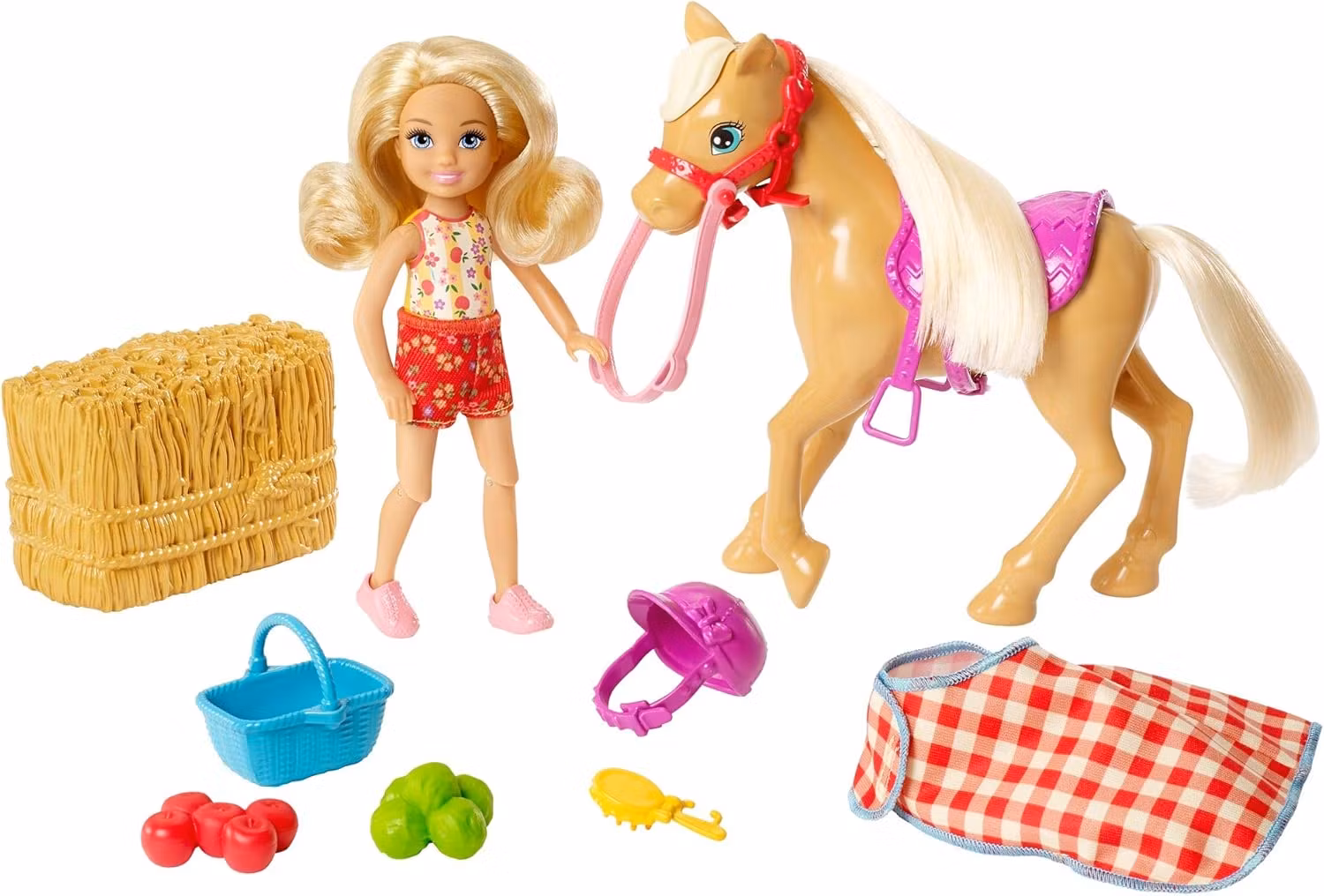 Chelsea-dockan älskar att ta hand om sin ponny och kommer med allt som behövs för fodring, borstning, ridning och vila. Hon har rörliga knän för att passa perfekt i sadeln och bär en avslappnad ridoutfit med hjälm, redo för äventyr!