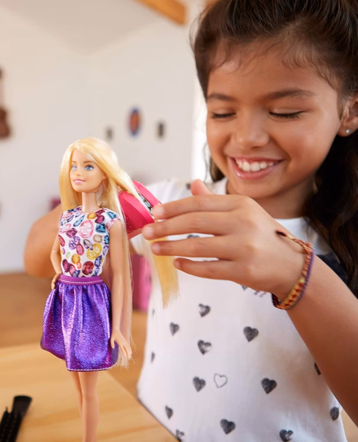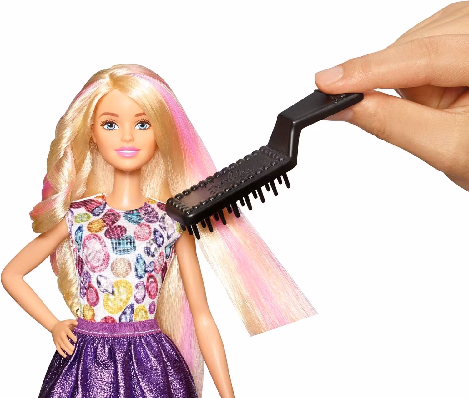 Barbie Docka Med Tillbehör DWK49 ger barnen möjlighet att skapa fantastiska frisyrer med färgskiftande effekter. Dockan har ljust hår som förändras magiskt med hjälp av medföljande stylingverktyg som en locktång, ett krusjärn och en borste – allt utan värme.