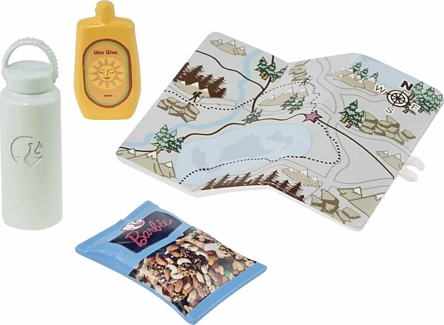 Vissa tillbehör har handtag som Barbie-dockan kan hålla för att förstärka berättarglädjen och rollspelen. Barbie-dockan har 11 leder för realistiska rörelser och är klädd i en sportig outfit med t-shirt som har texten ”Adventure vibes”, rosa shorts och bruna vandringsstövlar.