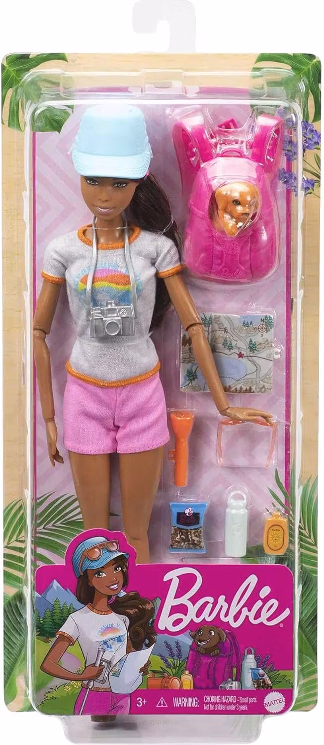Barbie-dockan är utrustad för naturutflykter med en karta, vattenflaska, solskyddskräm, mellanmål, ficklampa, mössa, glasögon, kamera och en rosa ryggsäck som även har plats för hundvalpen – den perfekta följeslagaren på äventyr.