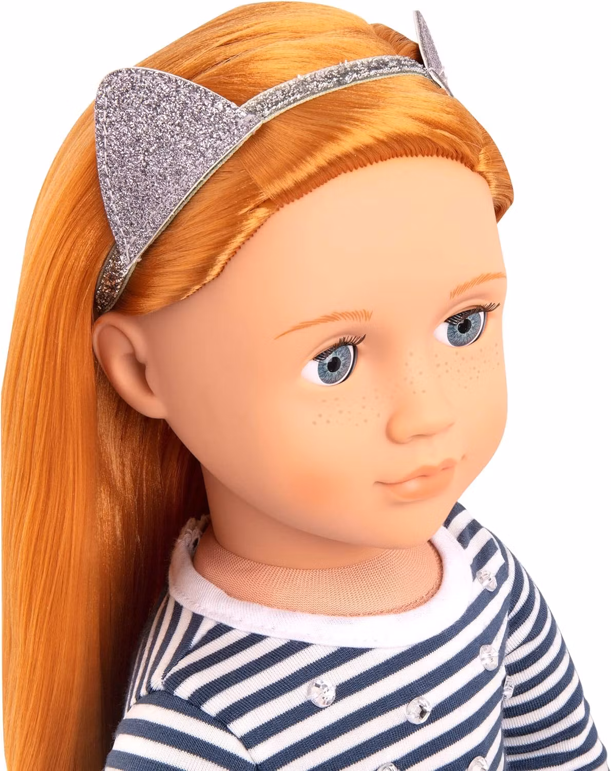 Arlee är en livlig och charmig docka som kommer att förtjusa alla barn. Hon är klädd i en snygg randig skjorta och en mintfärgad kjol, vilket ger henne en modern och lekfull look. För att komplettera sin outfit har hon på sig röda skor som matchar perfekt. Arlees oranga hår är både unikt och iögonfallande, och hon bär också ett hårband som lägger till en extra söt touch.
