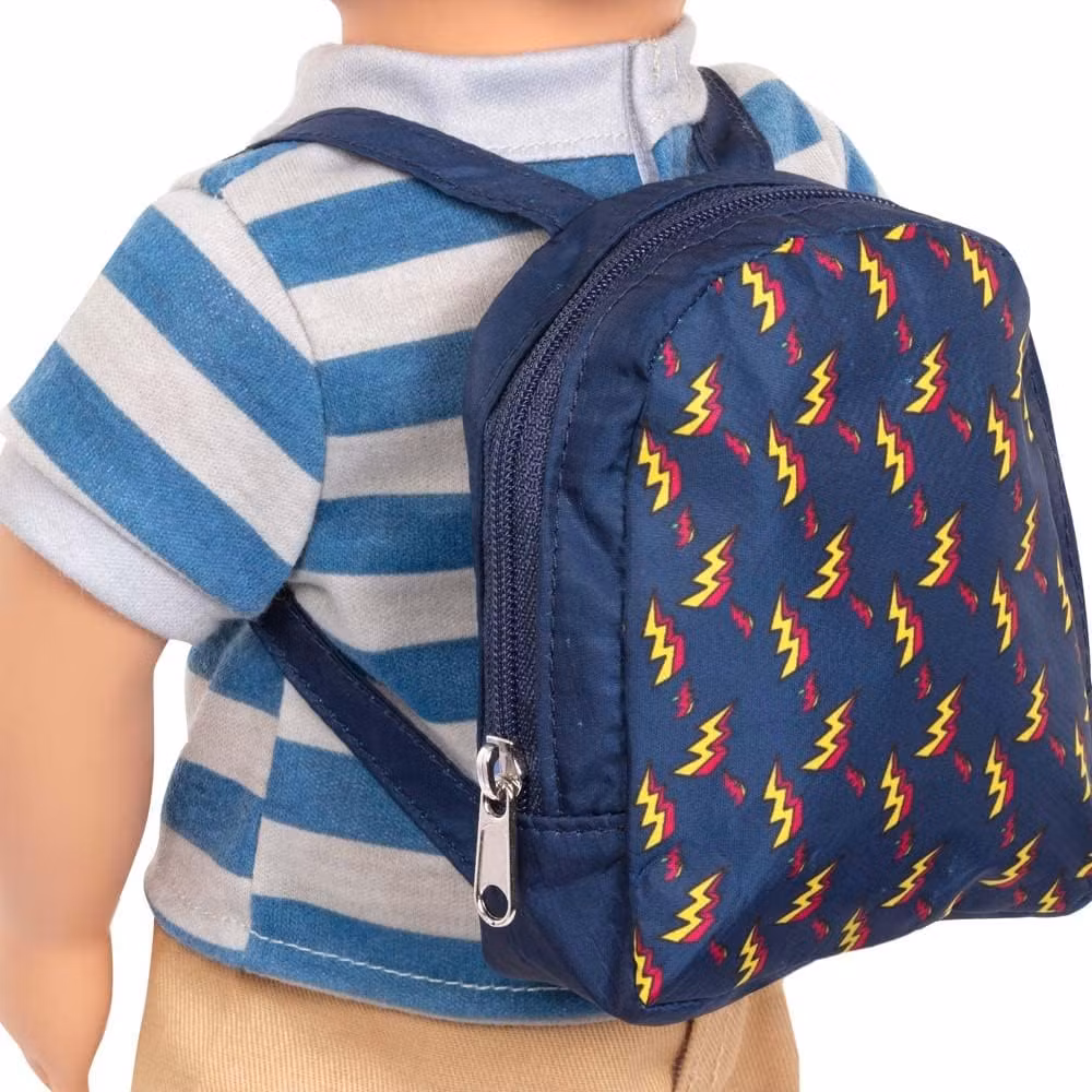 Leo är klädd i en randig blå och grå pikétröja, avslappnade shorts, blå skor och ett par matchande glasögon som ger honom en smart och avslappnad stil. Den sportiga ryggsäcken med bekväma remmar gör honom redo för skoldagen – perfekt för rollspel där barn får utforska vardagssituationer.