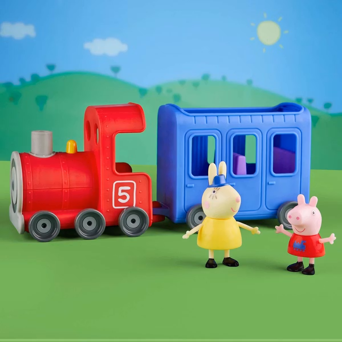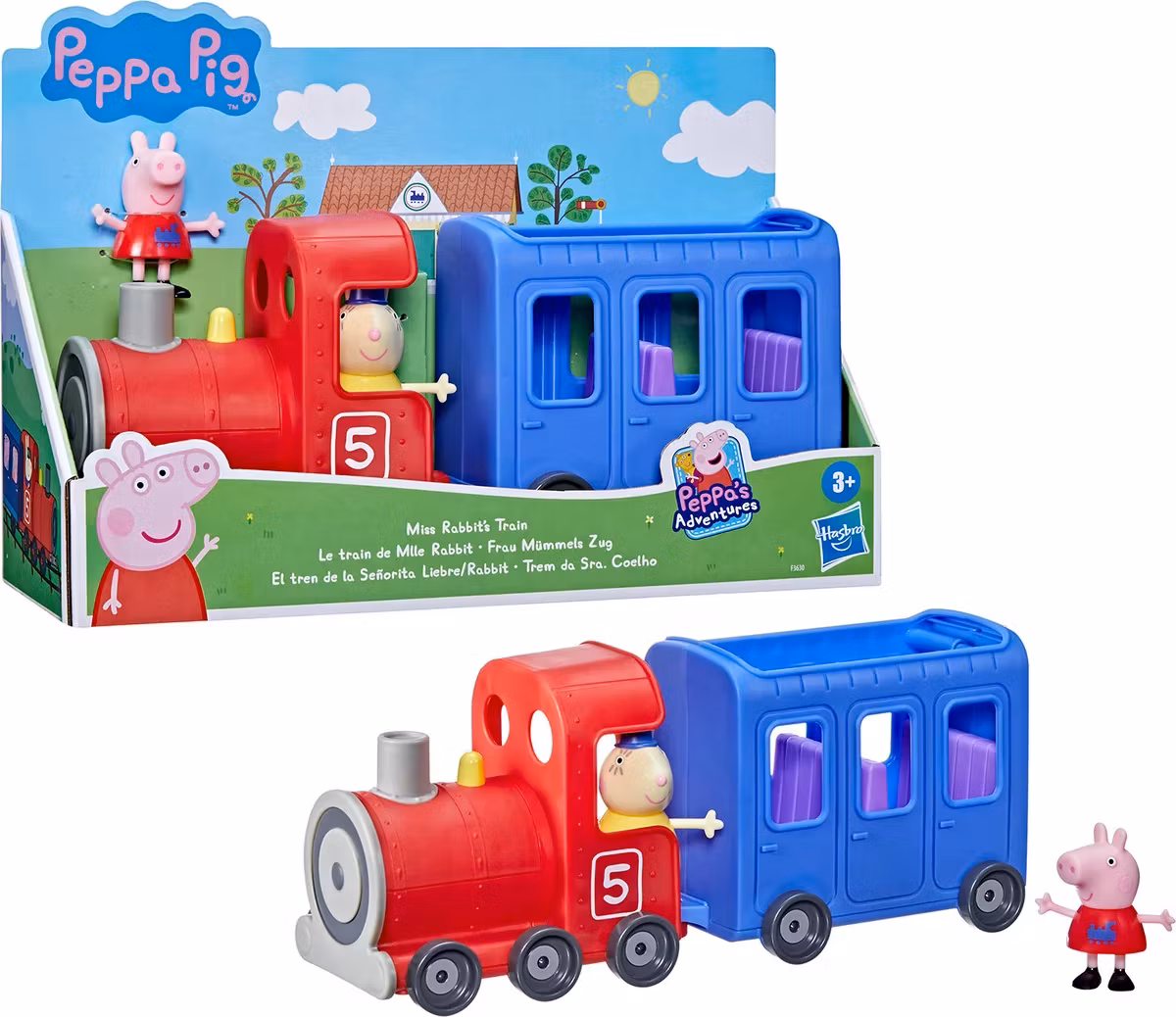 - Innehåll: Ett tåg och figurer av Fröken Kanin och andra karaktärer från Greta Gris.