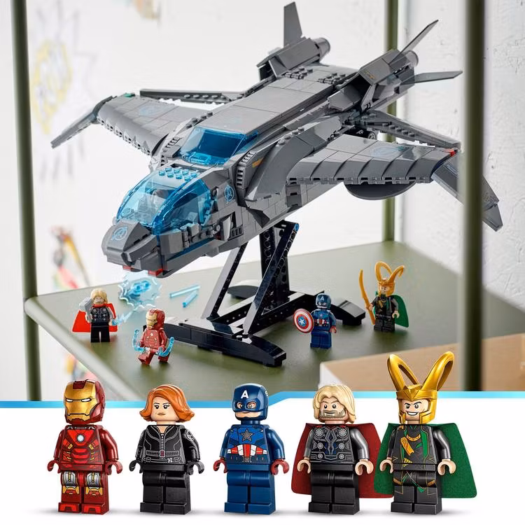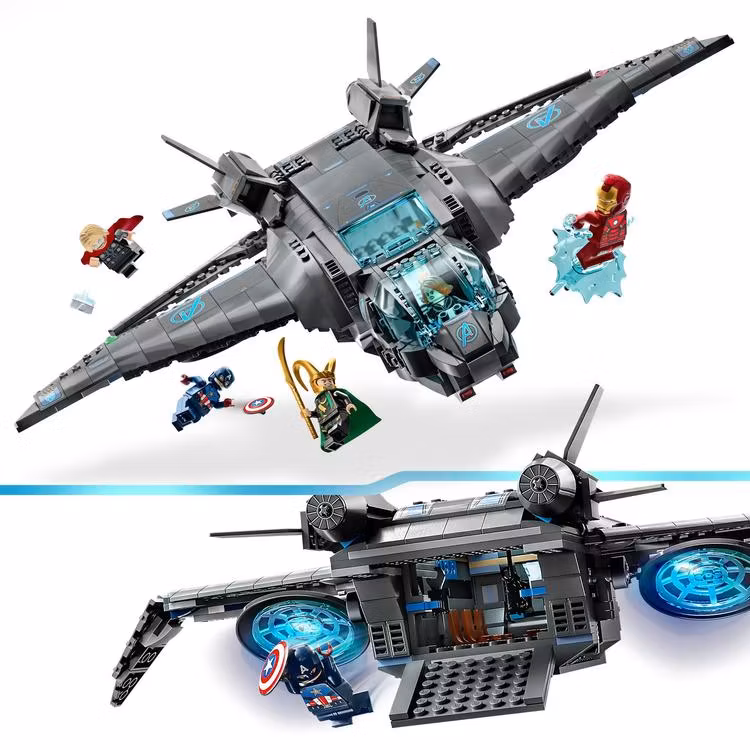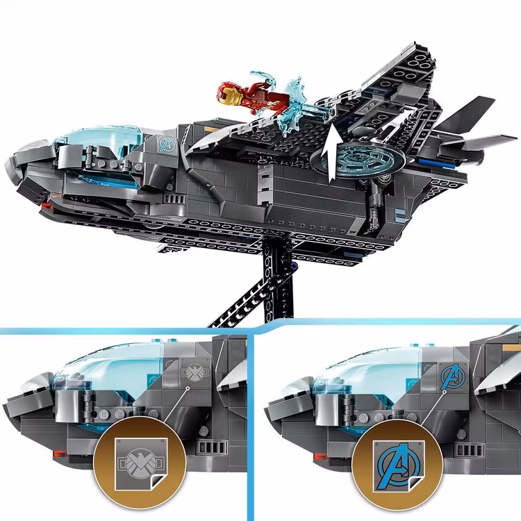 - Detaljerad Quinjet: Öppna den övre delen av Quinjet och placera minifigurerna i sina sittplatser, redo för action.