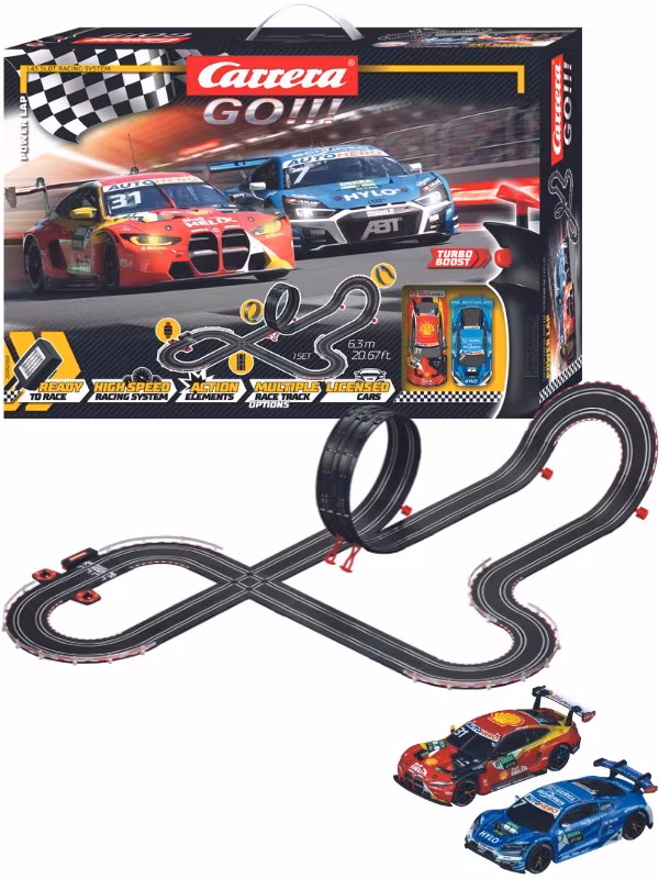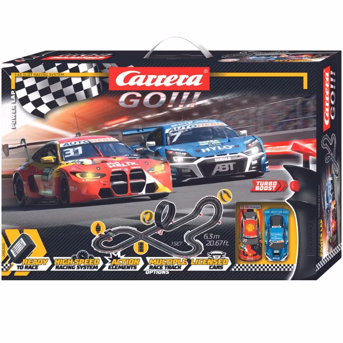 Upplev rallyaction hemma med Carrera GO!!! Super Rally Bilbana! Denna sportiga och klassiska bilbana från Carrera är ett perfekt val för alla racingfans. Setet inkluderar två dynamiska rallybilar och två handkontroller, vilket ger en äkta racingkänsla.