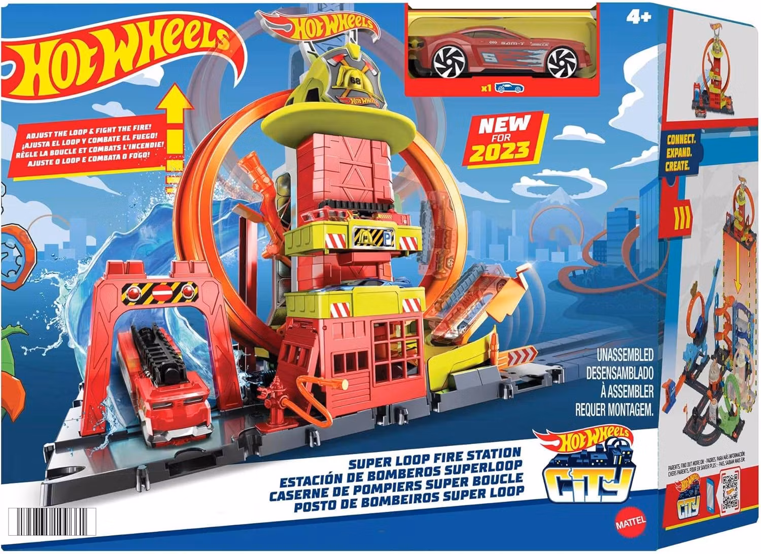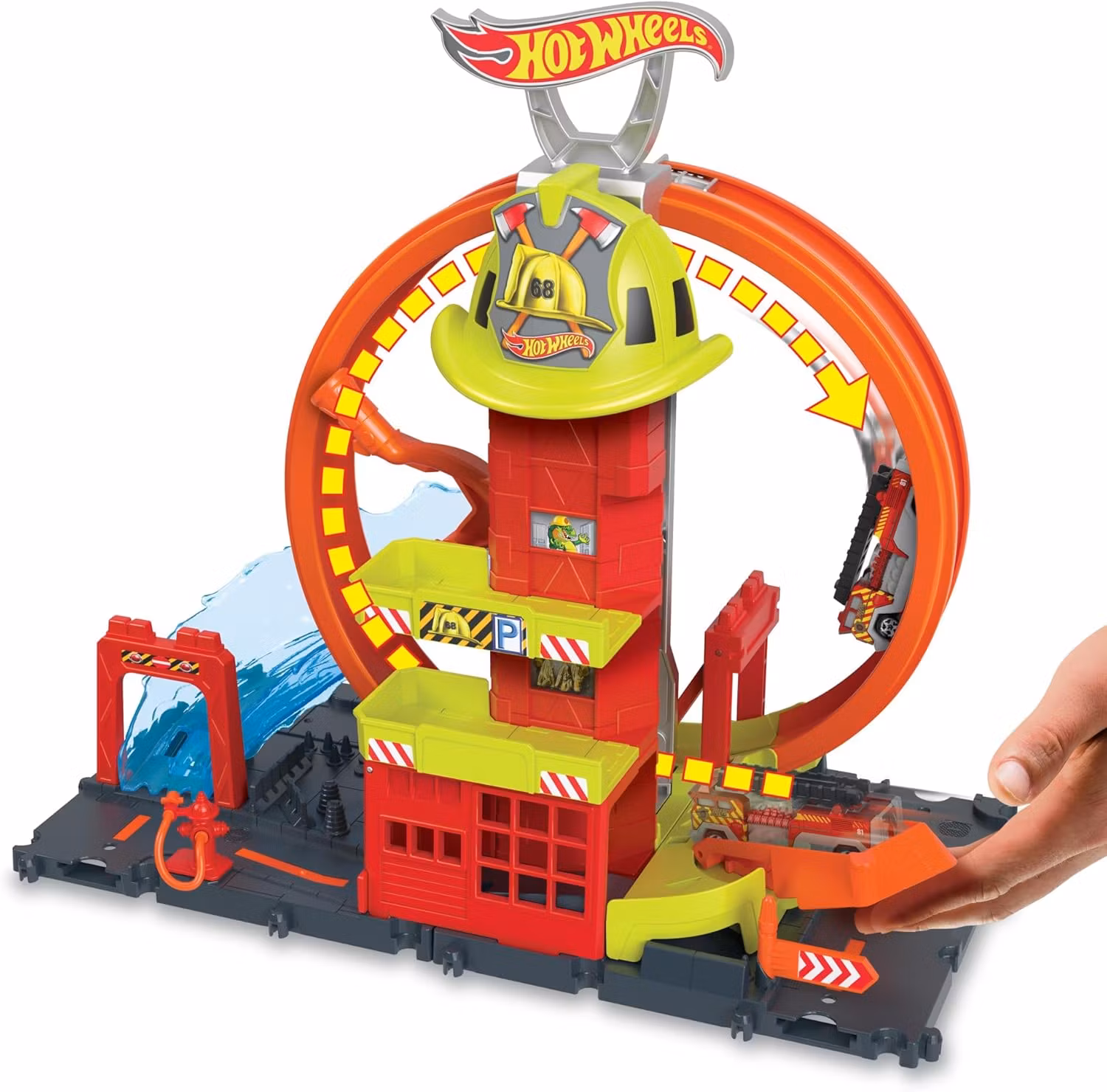 Hot Wheels bilbana City Super Loop Fire Station bjuder på fartfylld brandkårsaction med spektakulära stunts och en enorm loop! Här får barnen köra sin Hot Wheels-brandbil genom brandstationen, rädda staden och utföra häftiga trick längs vägen.