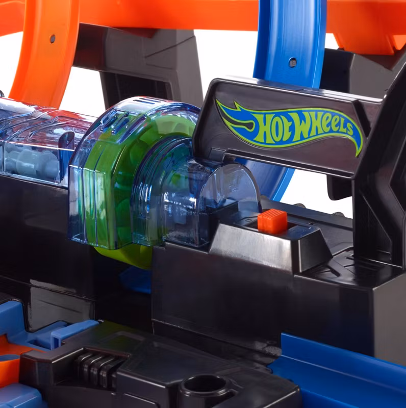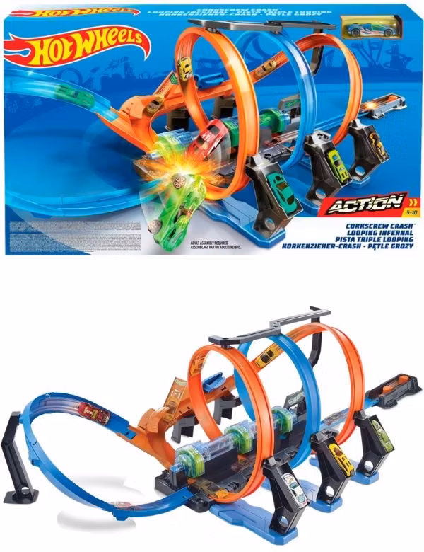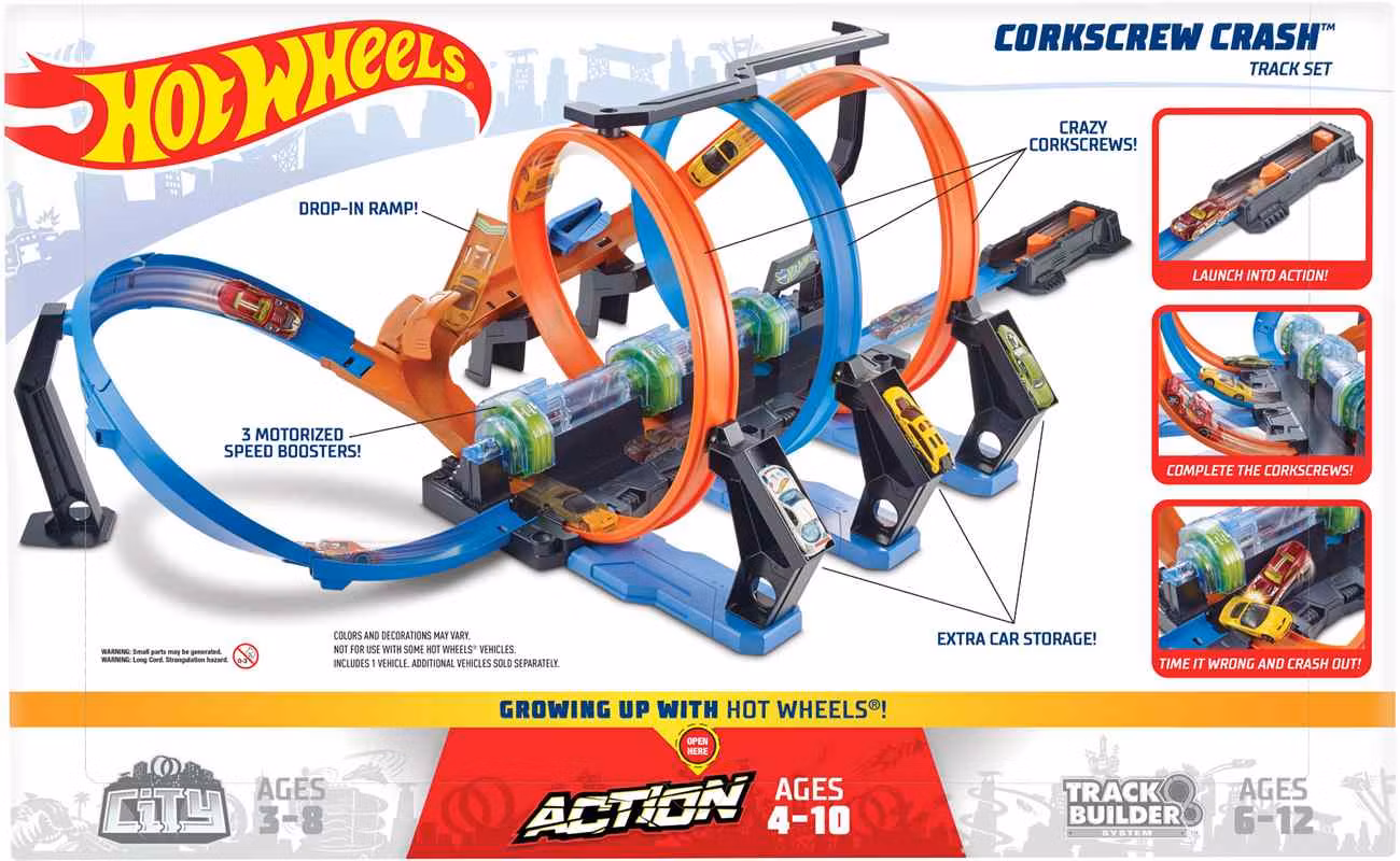 Hot Wheels Corkscrew Crash Track Set erbjuder spännande racing action med sin unika korkskruvs design. Utrustad med höghastighets boosters och trippel slingor skapar denna motoriserade bilbana en explosiv upplevelse med tre krockzoner. Barnen testar sina färdigheter genom att perfekt tajma sina bilar för att undvika krascher. Lägg till fler bilar för extra utmaning och spänning! Setet är kompatibelt med andra Hot Wheels-banor för en ännu större racingvärld. Perfekt för små racers som älskar fart och action
