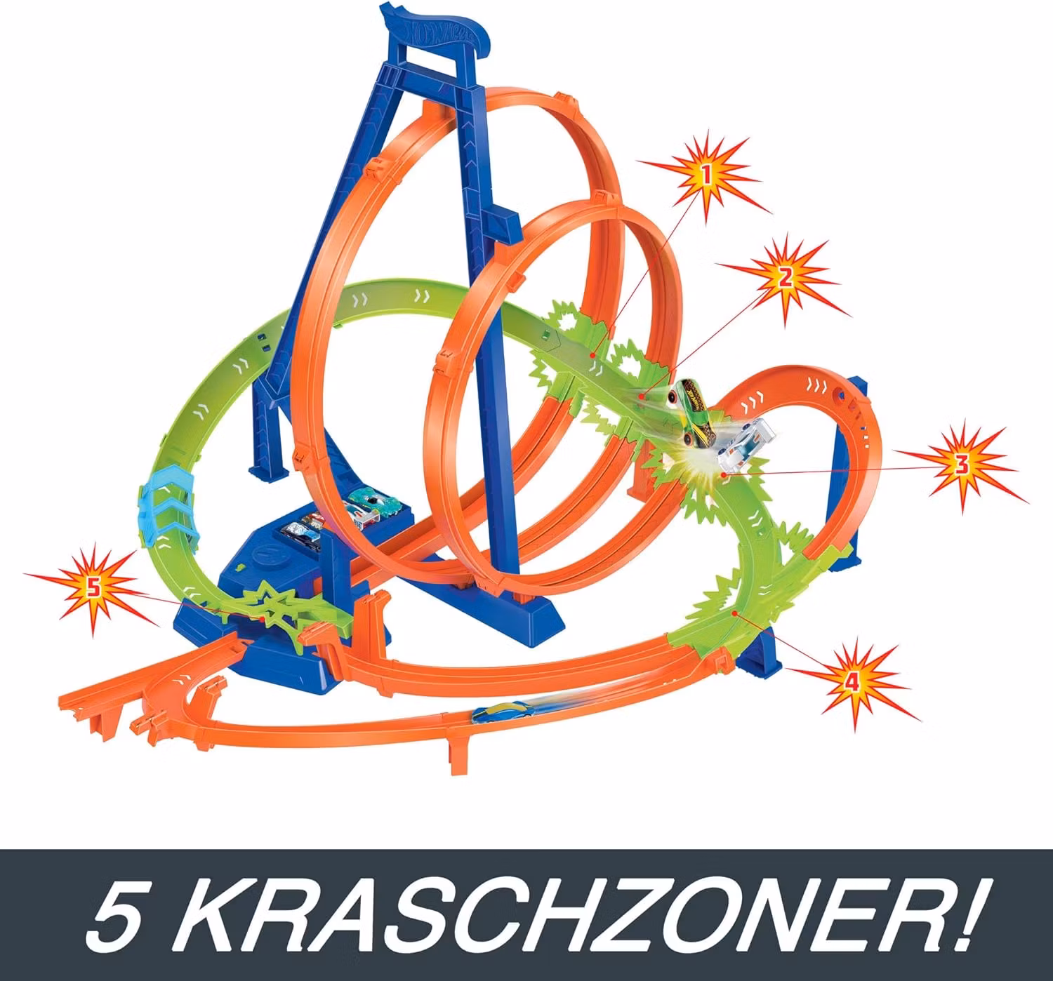 Den motordrivna boostern ser till att bilarna rör sig i hög hastighet genom banans olika sektioner, och varje kollision blir en ny överraskning. En Hot Wheels-bil ingår, men setet blir ännu roligare när fler fordon läggs till (säljs separat).