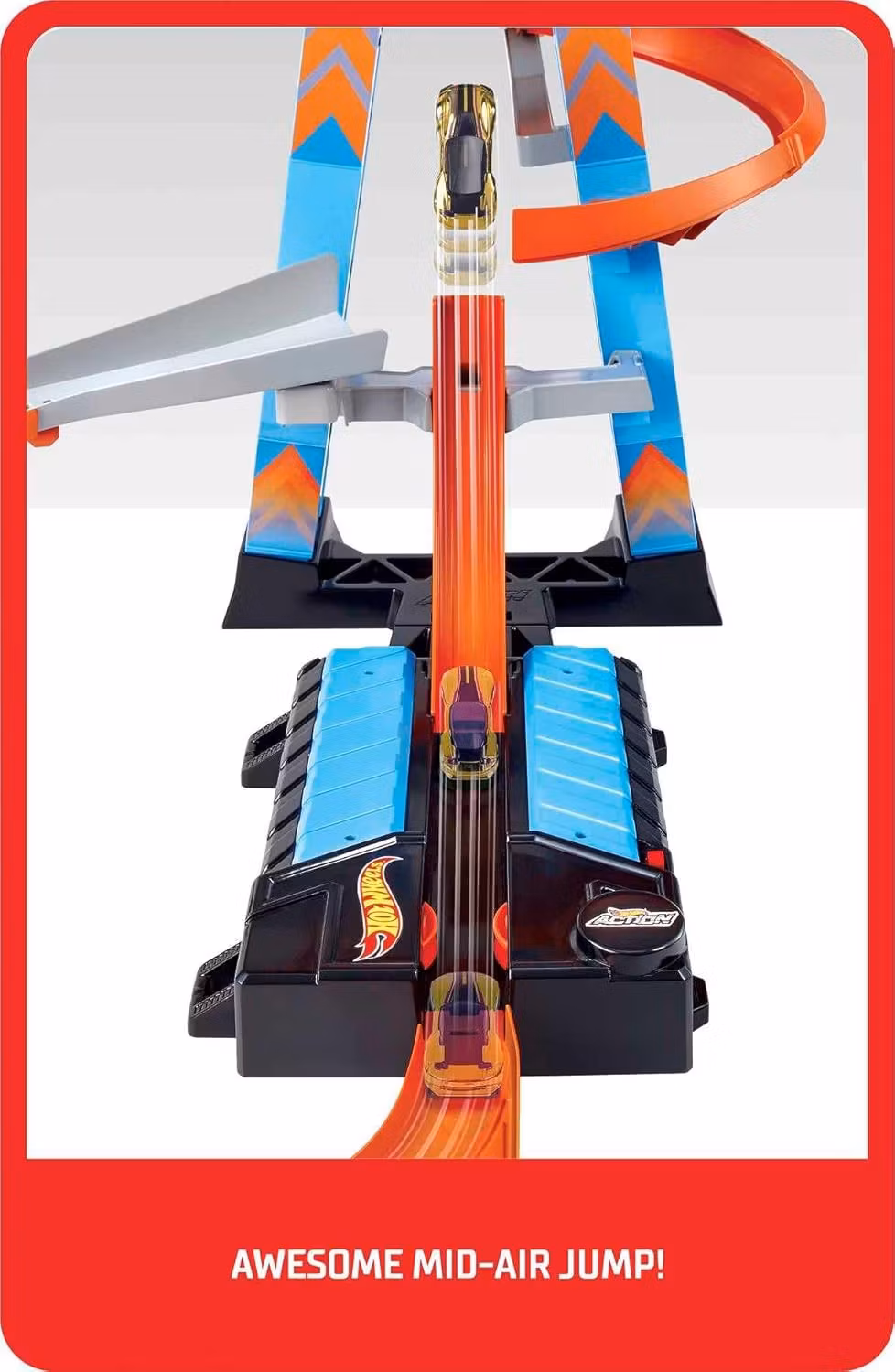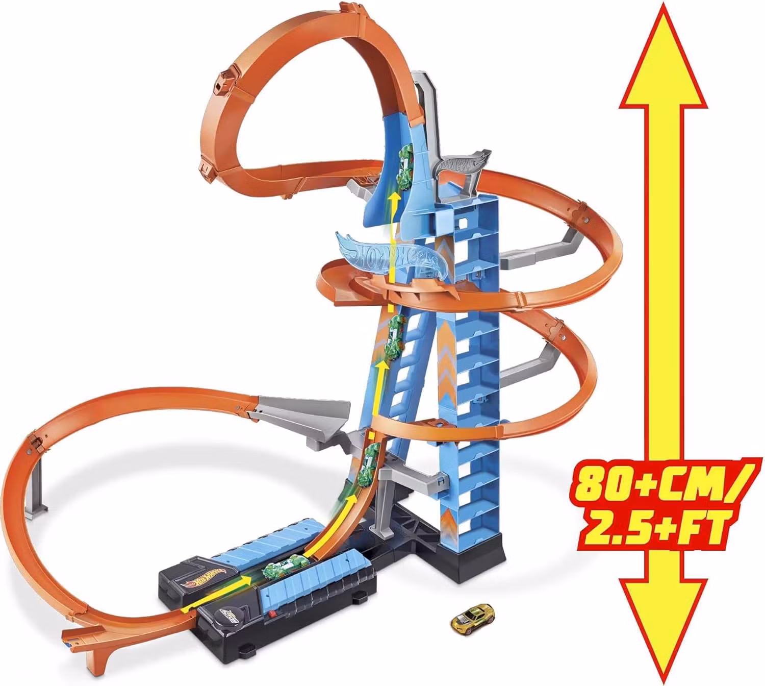 Barnen kan tävla med flera bilar samtidigt, skjuta dem upp genom loopen och se dem kollidera i luften i full fart. Tornet rymmer över 20 bilar, vilket gör det enkelt att utmana vännerna i spännande tävlingar eller skapa massiva krockscenarier.