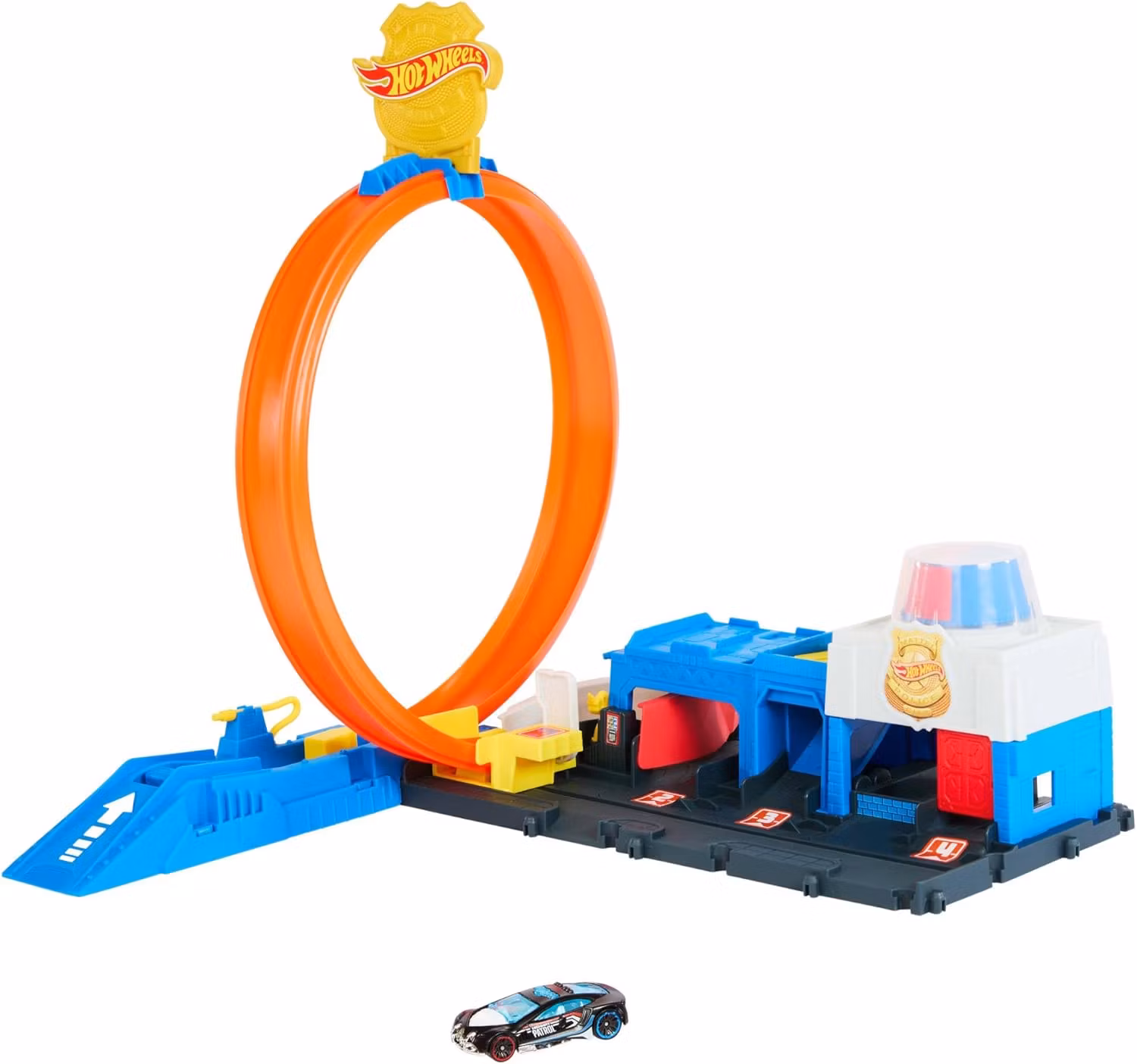 Hot Wheels bilbana Super Police Station bjuder på fartfylld polisaction där varje val leder till nya äventyr! Med fyra olika körbanor, justerbar loop och spännande hinder får barnen uppleva racing, stunts och dramatik i Hot Wheels City.