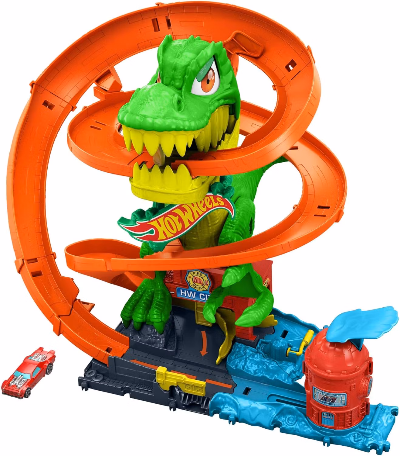 Hot Wheels bilbana T-Rex Blaze Battle bjuder in till en actionfylld strid mellan stadens hjältar och en rasande dinosaurie! Brandstationen i Hot Wheels City har attackerats, och det är upp till barnen att rädda dagen med den medföljande brandbilen i skala 1:64.
