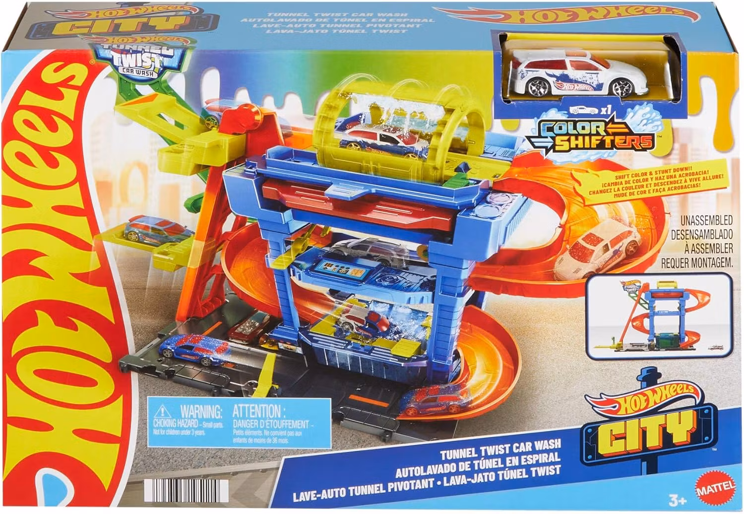 Hot Wheels bilbana Tunnel Twist Car Wash bjuder på en lekfull biltvätt där varje tur blir ett färgsprakande äventyr! Med den medföljande Hot Wheels Color Shifter-bilen kan barnen upptäcka hur färgerna förändras när bilen körs genom vatten i olika temperaturer.