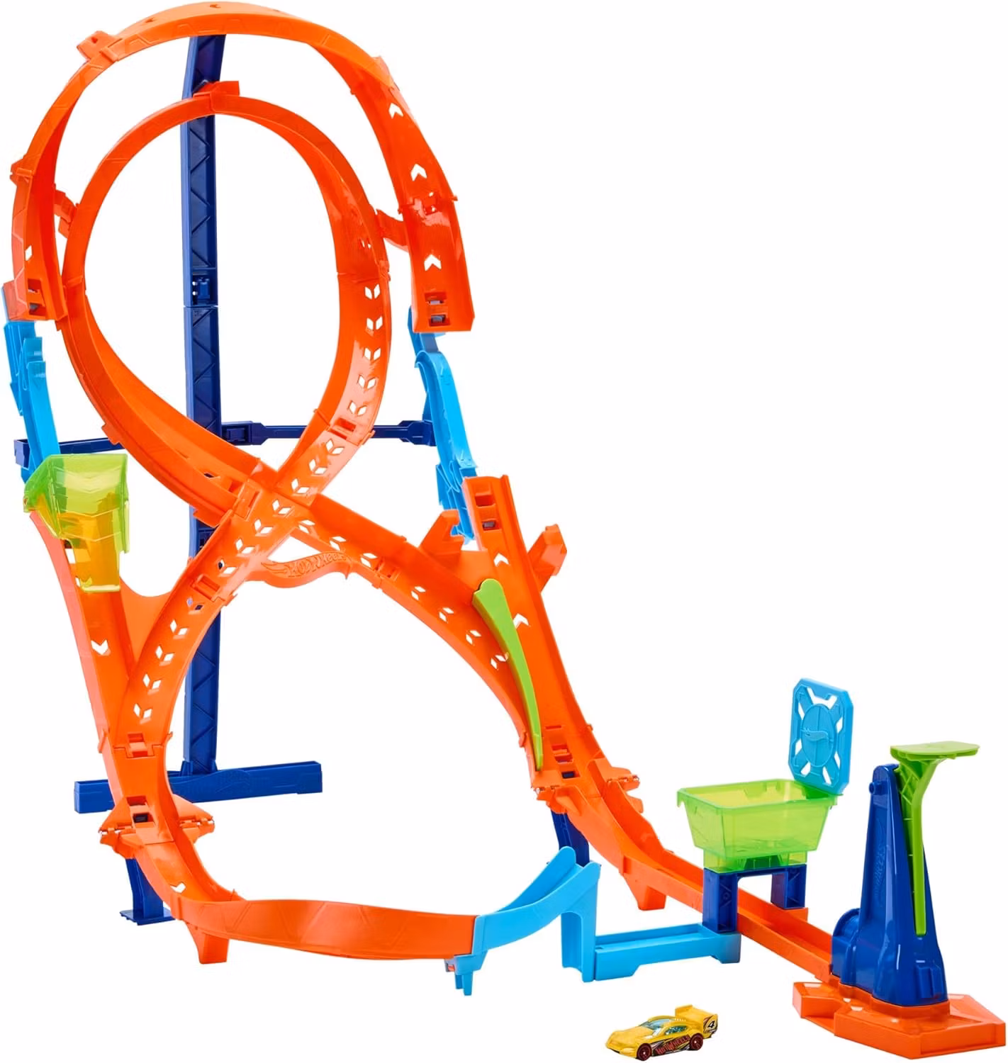 En Hot Wheels bilbana som kombinerar höjd, hastighet och kreativ racing – idealisk för barn som älskar fartfyllda utmaningar och spektakulära stunts!