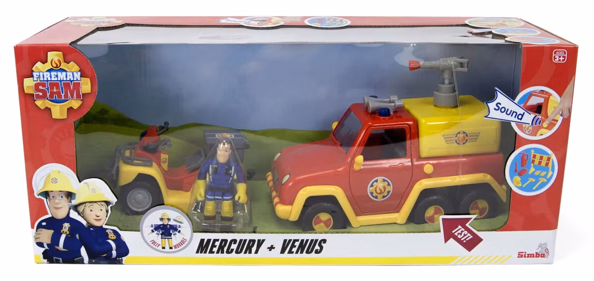 Detta spännande set från Brandman Sam-serien innehåller både den klassiska brandbilen Venus och den tuffa fyrhjulingen Mercury, komplett med en Brandman Sam-figur. Dessa fordon är inte bara utrustade med verklighetstrogna ljudeffekter, utan har även en fungerande vattenslang som kan spruta riktigt vatten – perfekt för att släcka bränder och rädda dagen.
