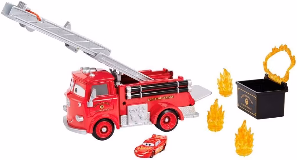 Disney Pixar Cars Color Changing 'Red' lekset är packat med fantastiska funktioner för oändliga lekmöjligheter med färgskiftande fordon. Låt barnen öva på att släcka en brand genom att fylla Reds vattentank med kallt vatten och flamtanken med varmt vatten. Med Blixten McQueen-figuren och två utdragbara stegar kan de utföra spännande stunts som att hoppa genom en ring av eld. Om figuren hamnar i Reds vattentank kan ett spray från vattenslangen ändra färgen tillbaka till sin ursprungliga blå.