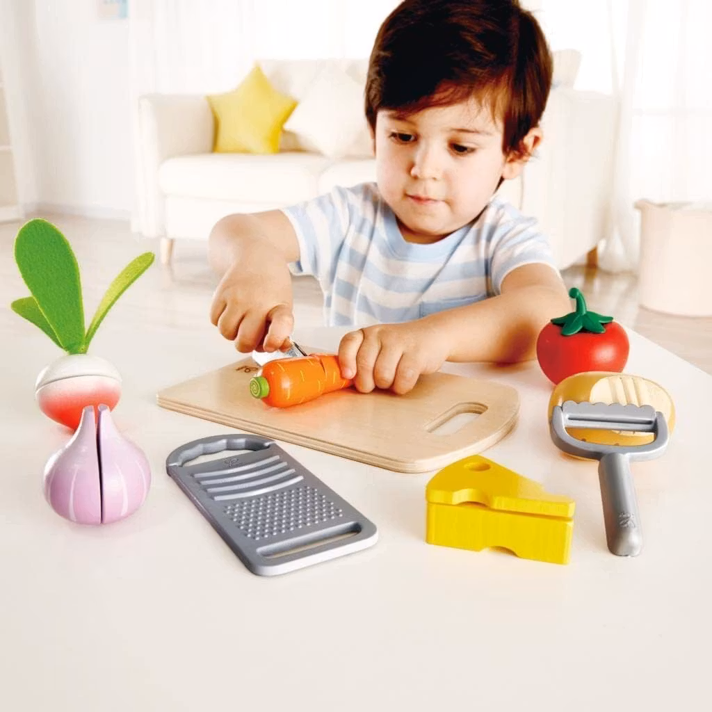 Hapes startset erbjuder en idealisk introduktion till köksleken, komplett med allt ett barn behöver för att börja sina kulinariska äventyr. Inkluderat i detta set är köksredskap och en skärbräda tillsammans med noggrant designade leksaksmatbitar som efterliknar riktiga råvaror. Denna detaljrikedom bidrar till en realistisk och engagerande lekupplevelse där barn kan öva på att skära och förbereda ingredienser precis som en riktig kock. Perfekt för att stimulera kreativitet och finmotorik.