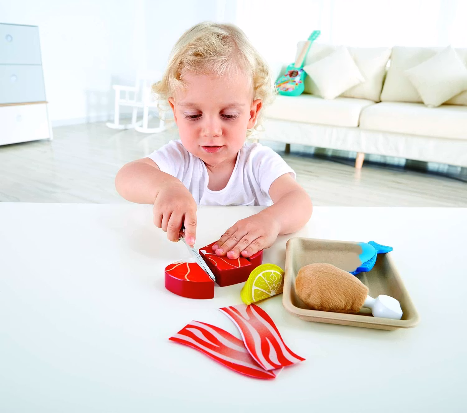 Hape Mumsiga Proteiner är den perfekta leksaken för barn som älskar att utforska matlagning och servering genom rollekar. Detta set består av olika typer av realistiskt och detaljerat designade proteinkällor, perfekt för fantasifullt och detaljerat rollspel. Barnen kan njuta av att "tillaga" och "servera" ett kycklingben, en biff, en fisk och två skivor bacon. Setet inkluderar även en leksakskniv för "skärning" och en citronklyfta för att "krydda" maten