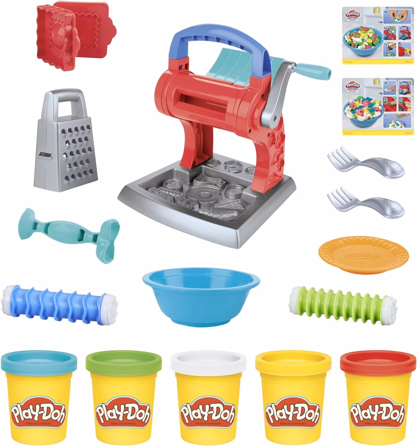 Inspirerat av traditionella pastamaskiner, låter detta lekset barn forma olika typer av Play-Doh-pasta med hjälp av två utbytbara rullar.