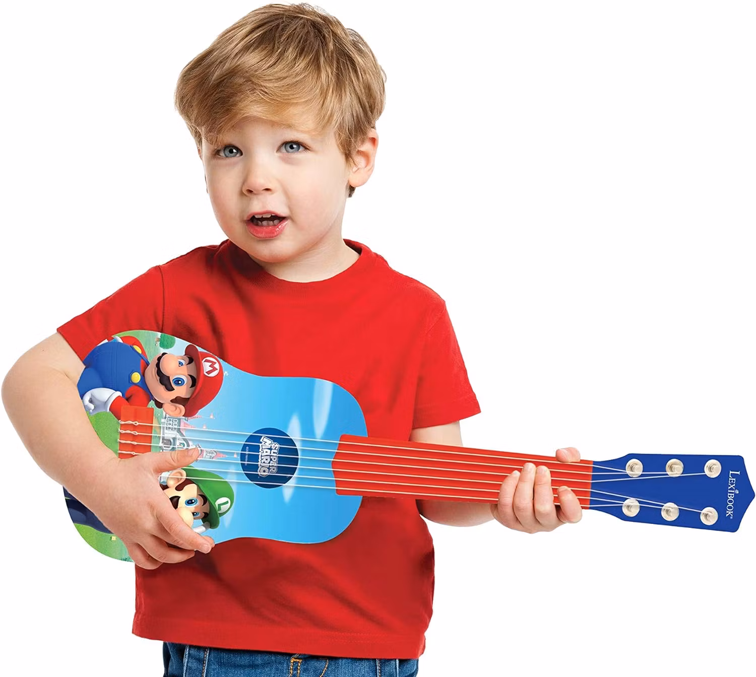 Super Mario Barngitarr 53 cm är det perfekta första instrumentet för unga musiker. Med sin färgglada design och Super Mario-tema gör denna gitarr lärande både roligt och inspirerande. Den är utformad för att hjälpa barn att komma igång med gitarrspel genom en enkel inlärningsguide som visar hur man håller instrumentet, var man placerar händerna, hur man stränger upp gitarrsträngarna och spelar några grundläggande ackord.