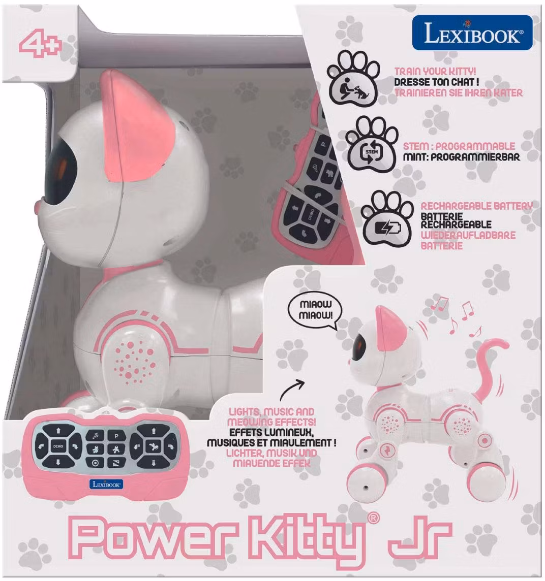 Lexibook Power Kitty Jr är en radiostyrd robot som kombinerar rörelse, musik och lek i ett format som inspirerar både nyfikenhet och glädje – en vänlig följeslagare i vardagens alla äventyr.